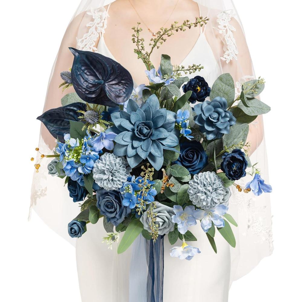 Ling's Moment 13 Inch Artificial Wedding Bouquets for Bride Bridal Bouquet Bridesmaid Bouquet Tossing Bouquet for Wedding Ceremony Anniversary Bridal Shower(Blu-dusty Blue & Navy-2)