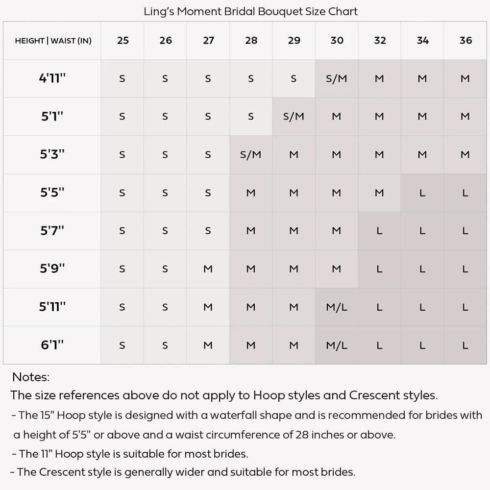 Size: This Wedding Bouquets for Bride is approx. [13 inches W x 11 inches H]. With ribbons card. This size is typically suitable for most brides to carry, this one is recommend for 4'11″-6'1″height and 25″ waist, 4'11″-6'1″height and 26″ waist, 4'11″-5'7″height and 27″ waist, 4'11″-5'3″height and 28″ waist, 4'11″-5'1″height and 29″ waist, 4'11″height and 30″ waist.