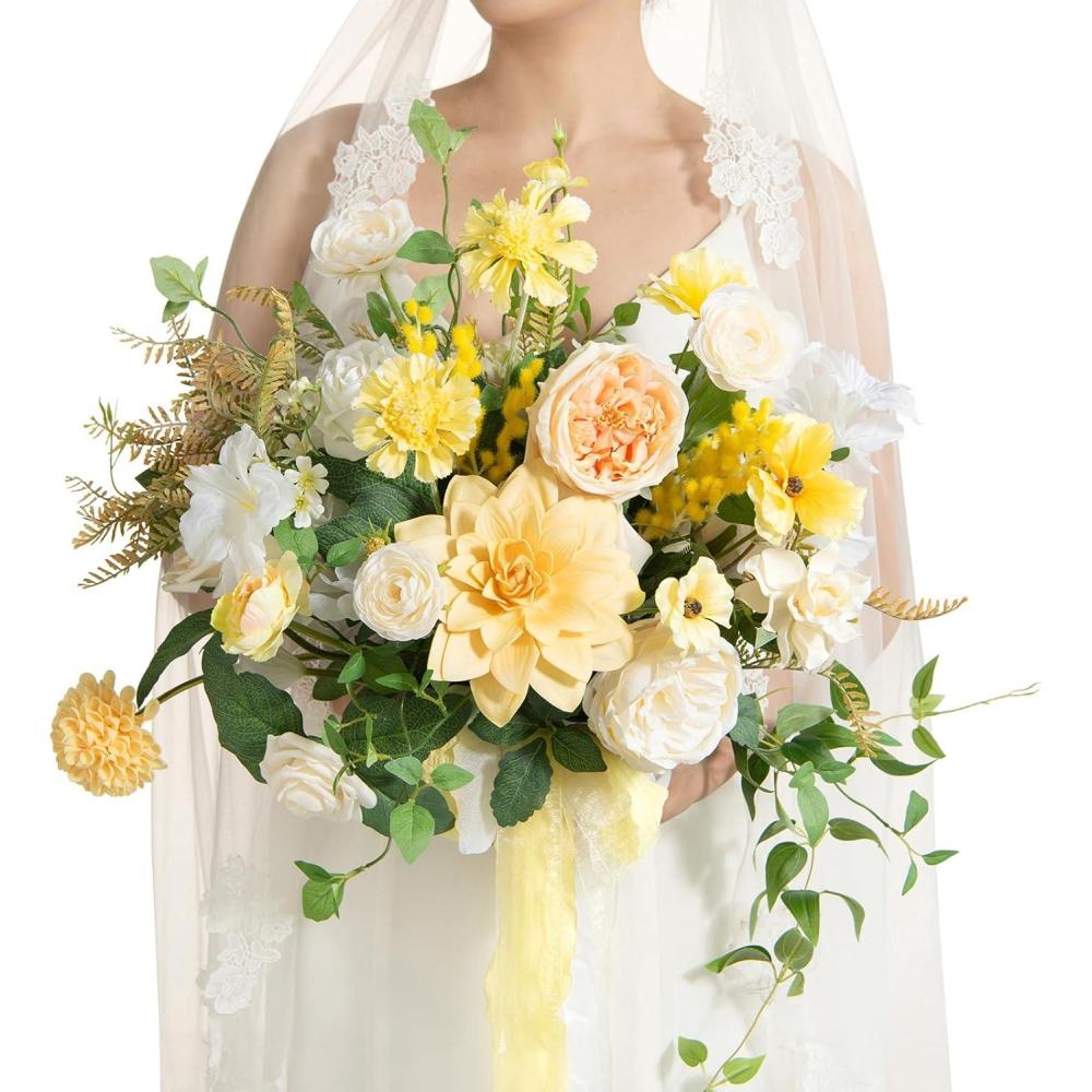 Ling's Moment 13 Inch Artificial Wedding Bouquets for Bride Bridal Bouquet Bridesmaid Bouquet Tossing Bouquet for Wedding Ceremony Anniversary Bridal Shower(Ylw-creamy Yellow&scallion Green)