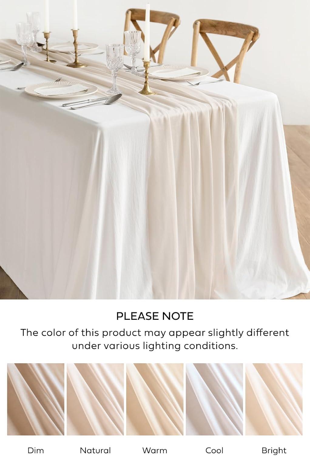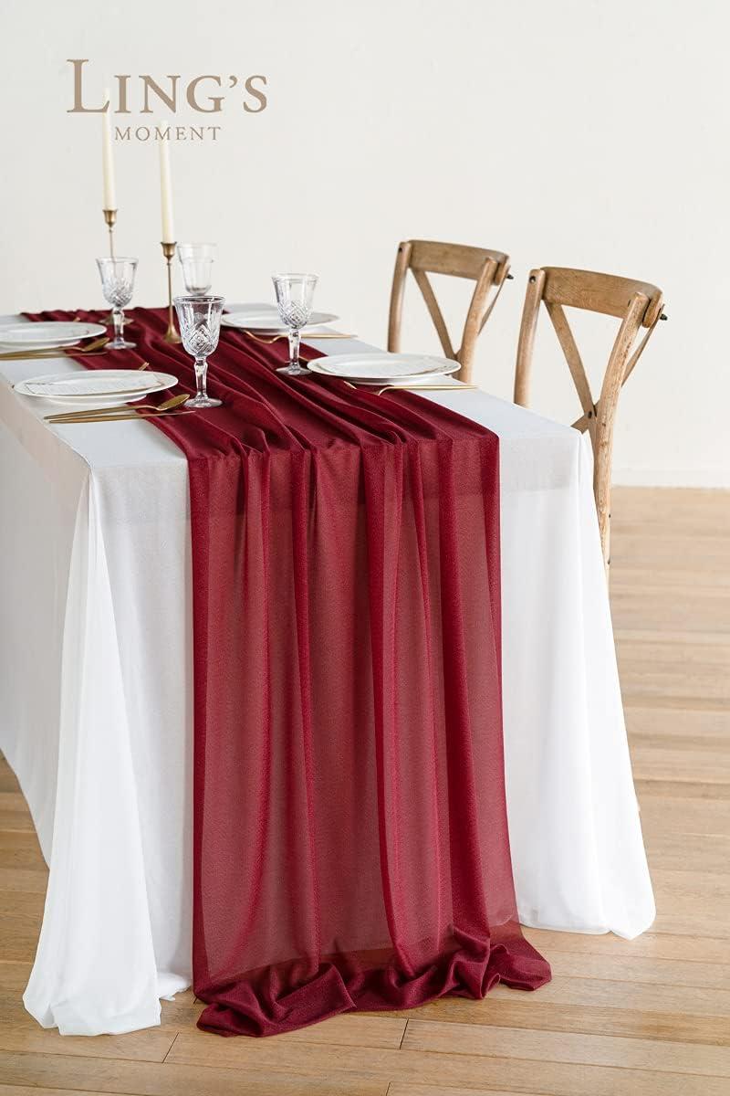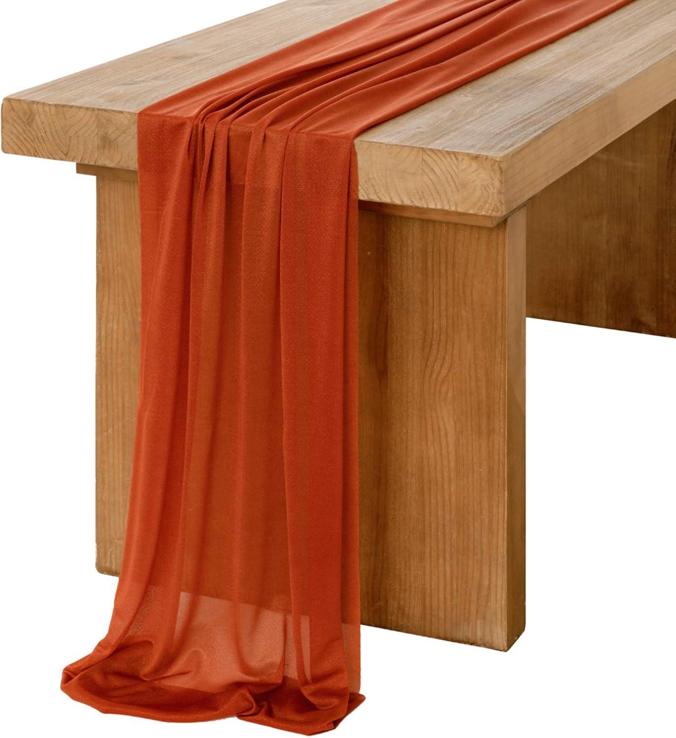 Material: 100% Polyester. Thermal cutting no seaming technique makes this sheer table runner more graceful than traditional fabrics. It shimmer a bit which looks elegant under lights, very flowy.