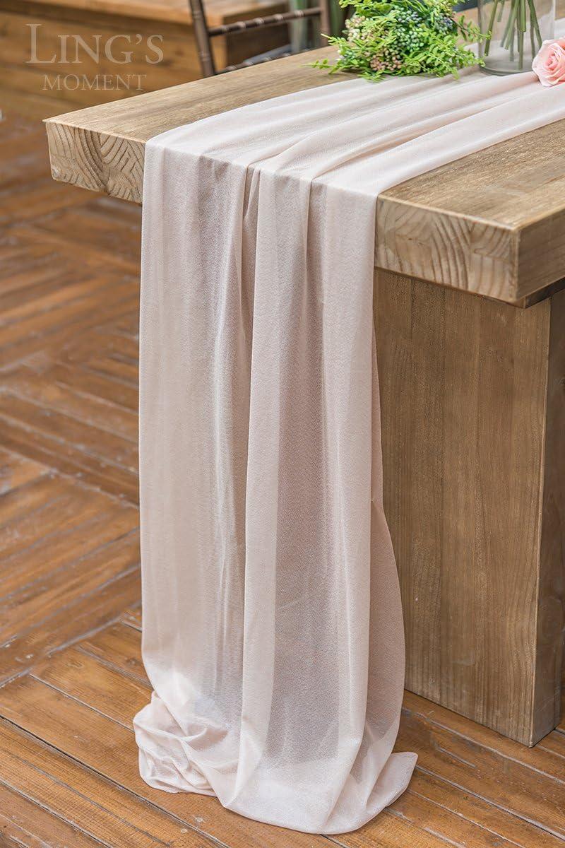 Unique wrinkle-resistant fabric makes this table runner READY TO GO. Two ribbon ties are included for gathering soft luminous folds looking at both ends. Or you may just let it drapes gracefully across your table and flows onto the floor in dreamy pools of fabric.