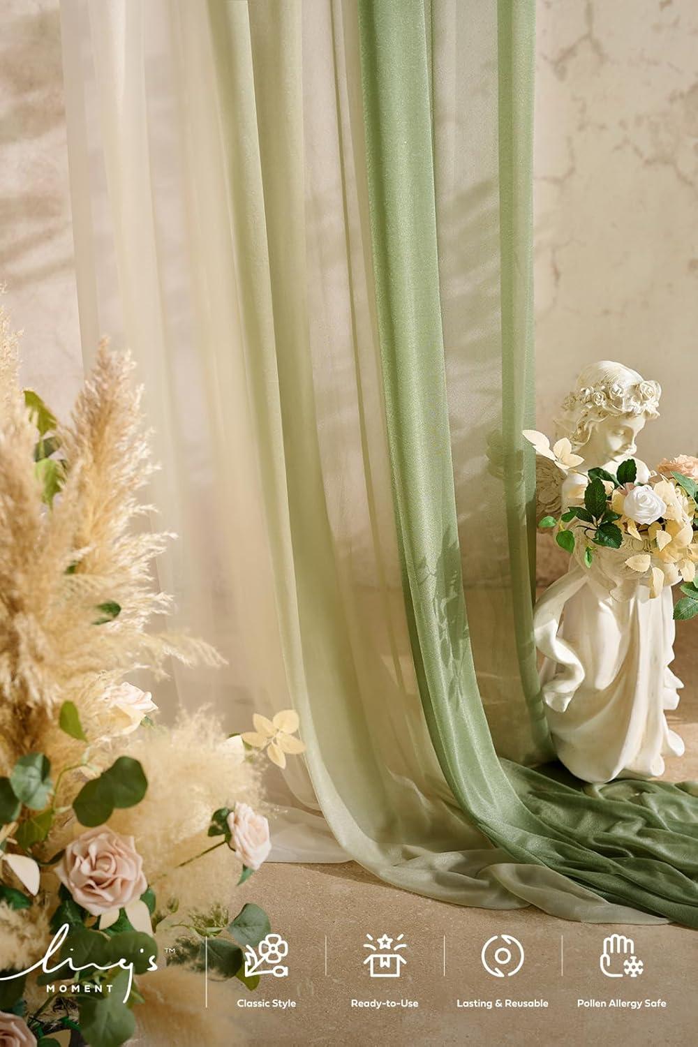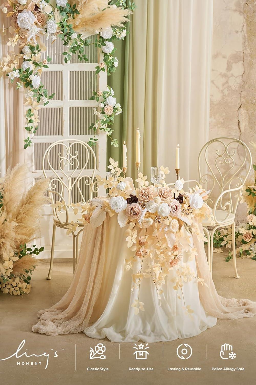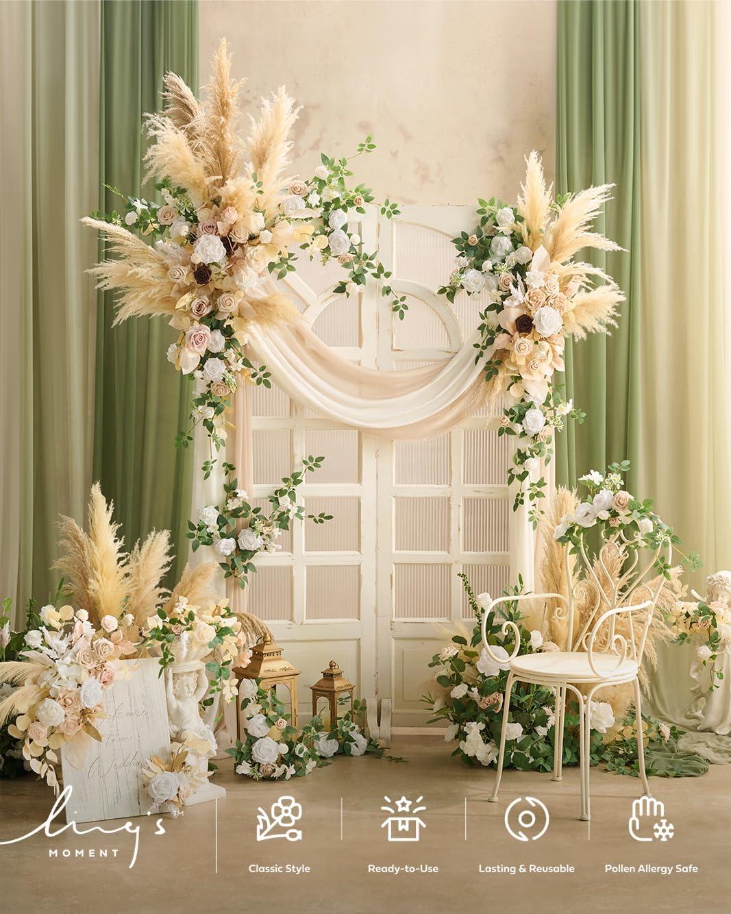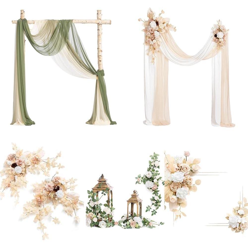 Size: The arch flowers suitable for the arch: 5ft x 6.5ft. Each flower swag is about 26″long x 22″ wide x 4.8″tall (after fluffed). Each flower garland is about 1.8 feet long. The large fake flower swag design measures about 15″-20″ long and 7″ wide, the small corner flower tie measures 7″ long and 5″ wide. 2 panels are 30″ W x 30ft L & 1 panel is 30″ W x 26.6ft L.