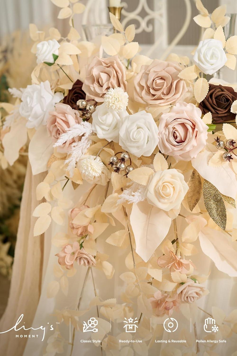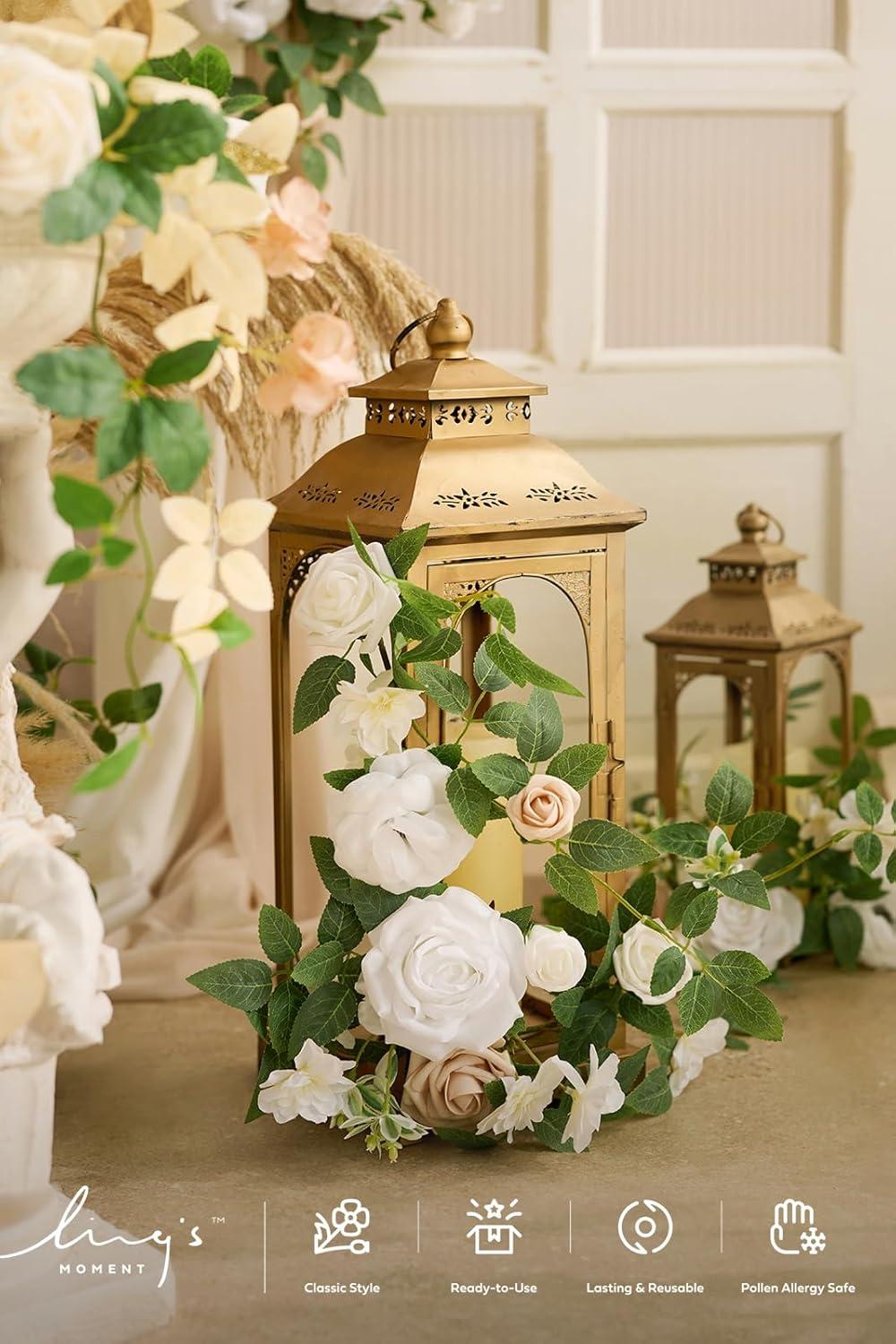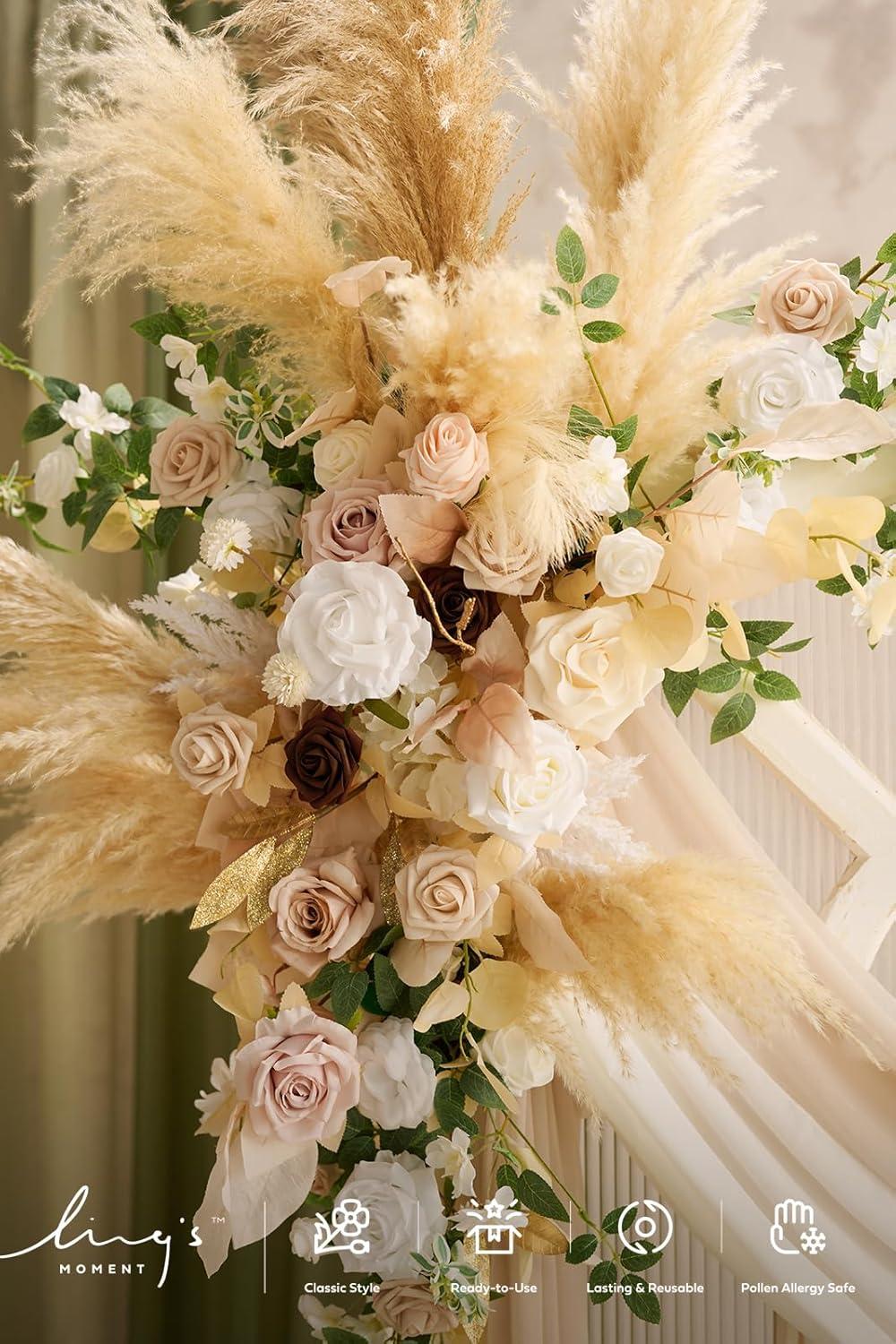 Size: The arch flowers suitable for the arch: 5ft x 6.5ft. Each flower swag is about 26″long x 22″ wide x 4.8″tall (after fluffed). Each flower garland is about 1.8 feet long. The large fake flower swag design measures about 15″-20″ long and 7″ wide, the small corner flower tie measures 7″ long and 5″ wide. 2 panels are 30″ W x 30ft L & 1 panel is 30″ W x 26.6ft L.