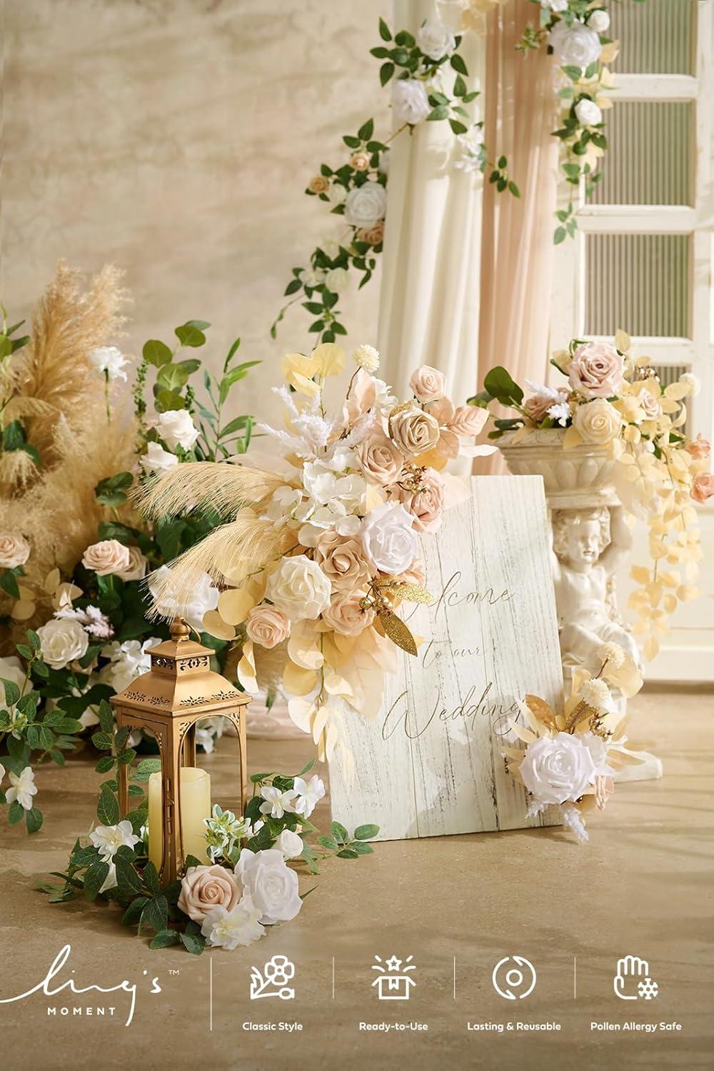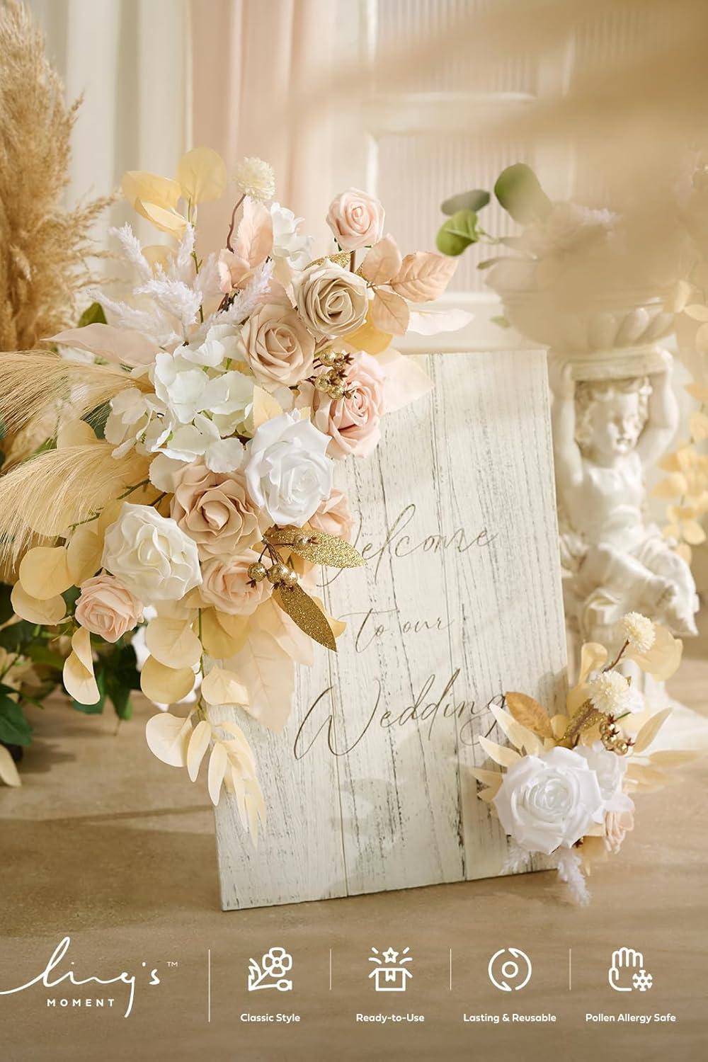 Package: Arch Flower x 2, flower swag x 2, flower garland x 6, sign flower x 2, arch drapes x 3