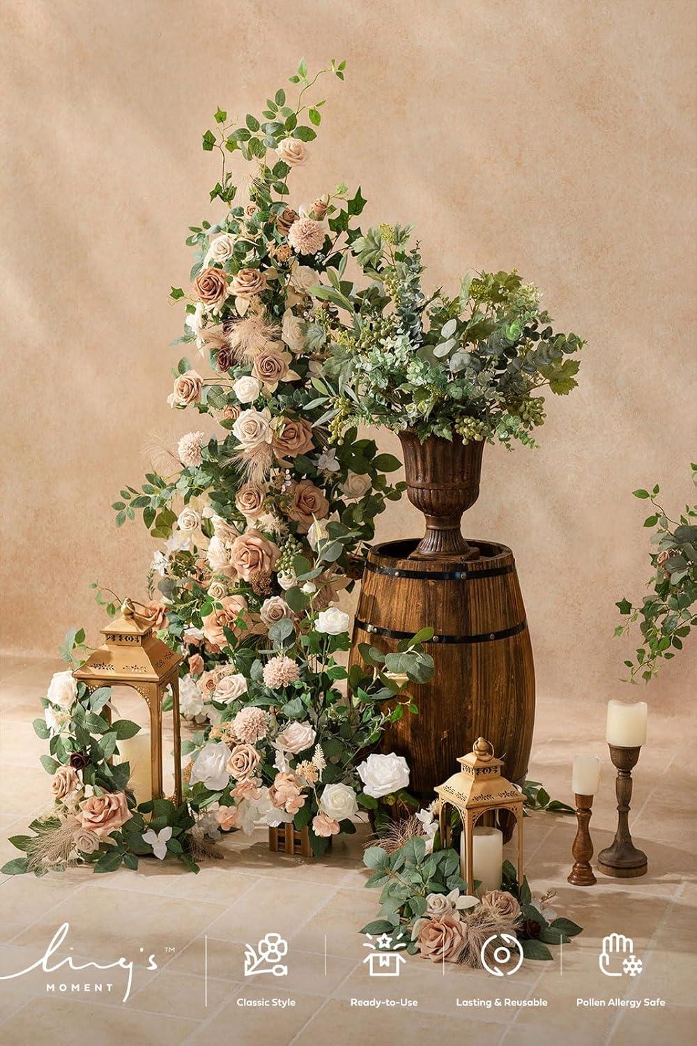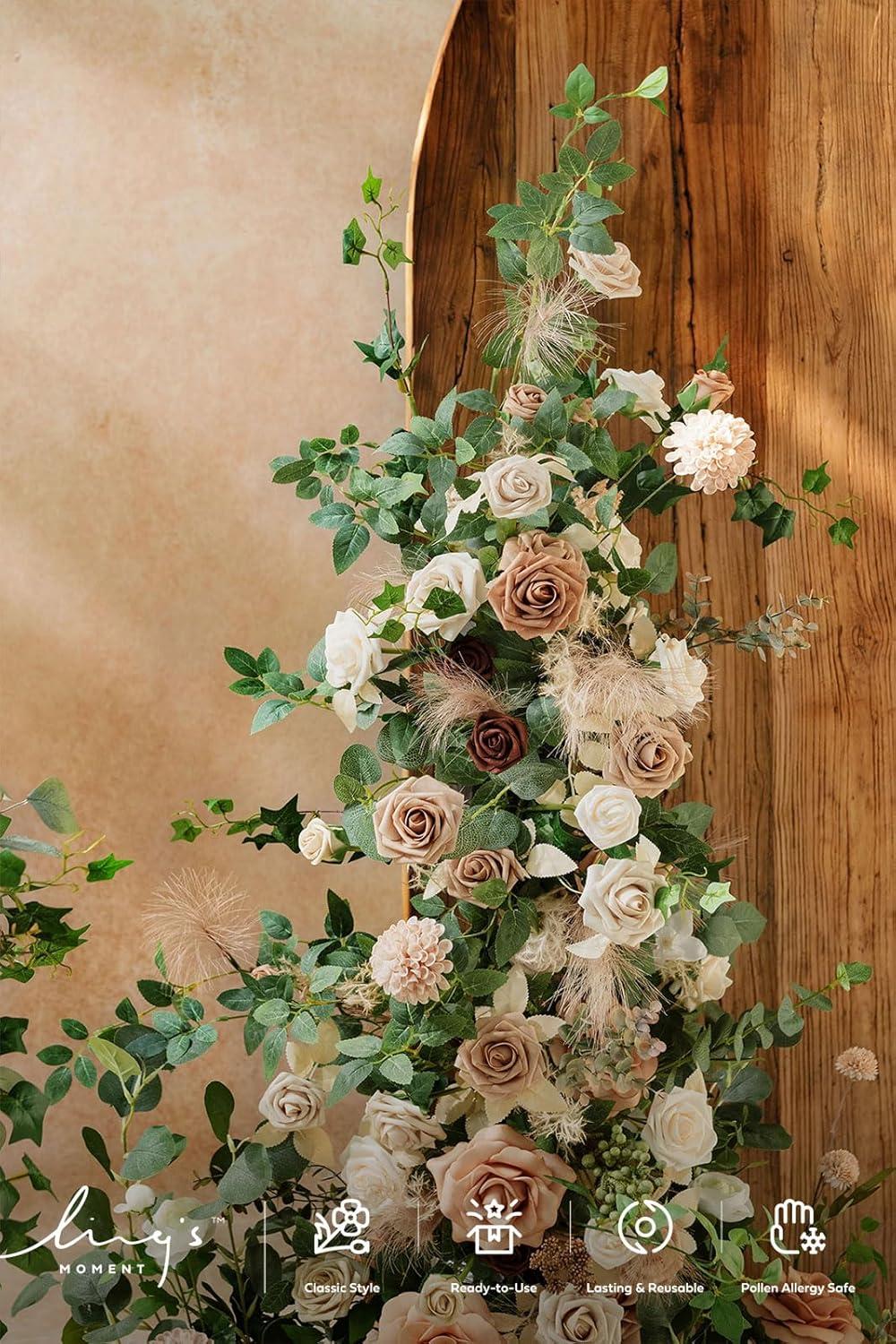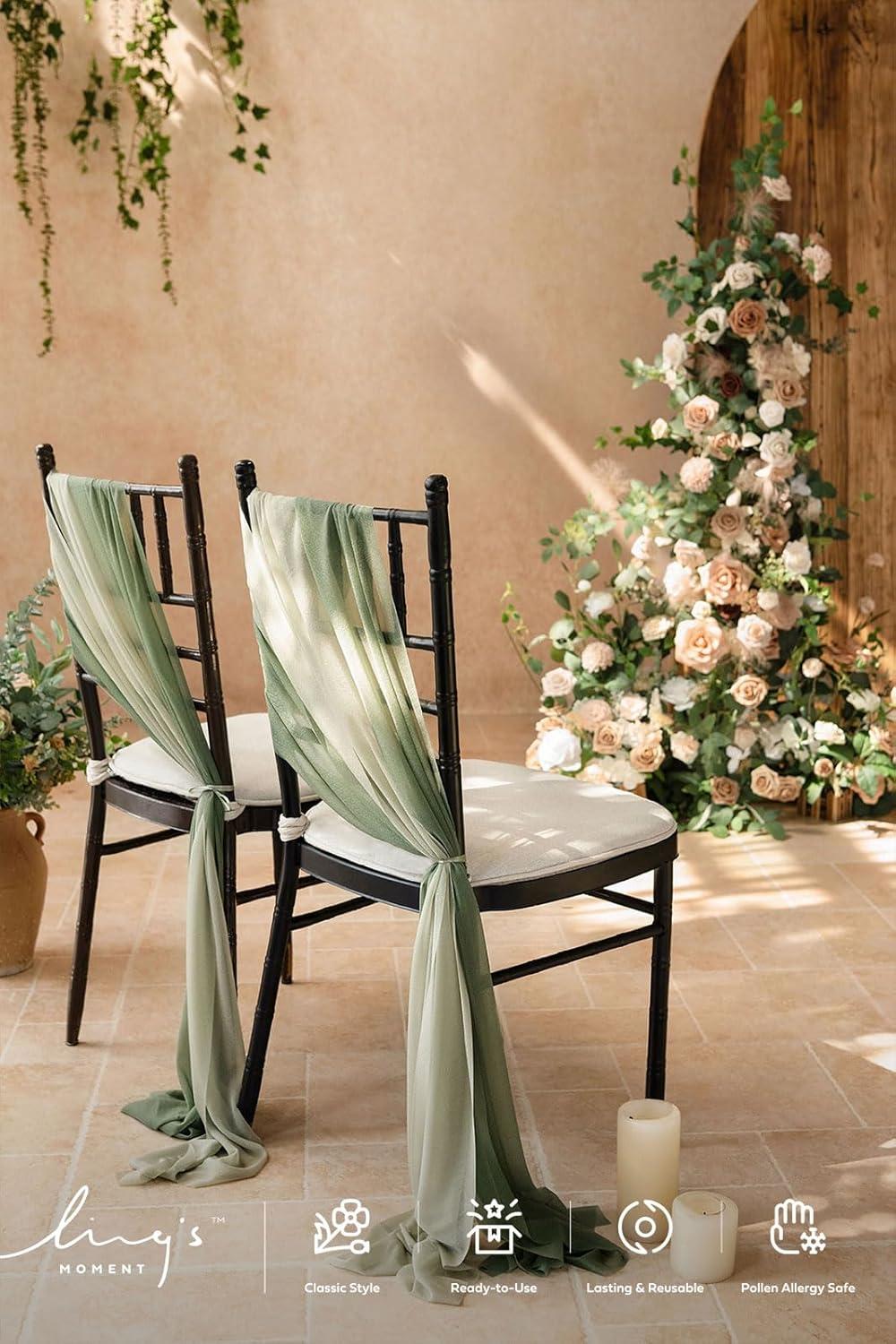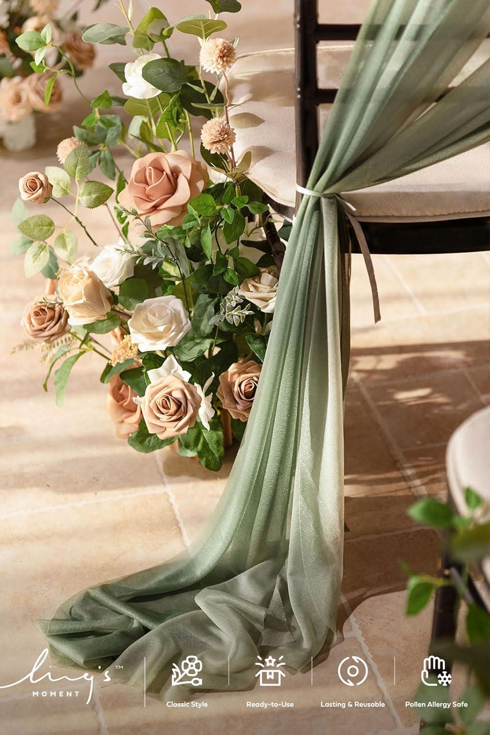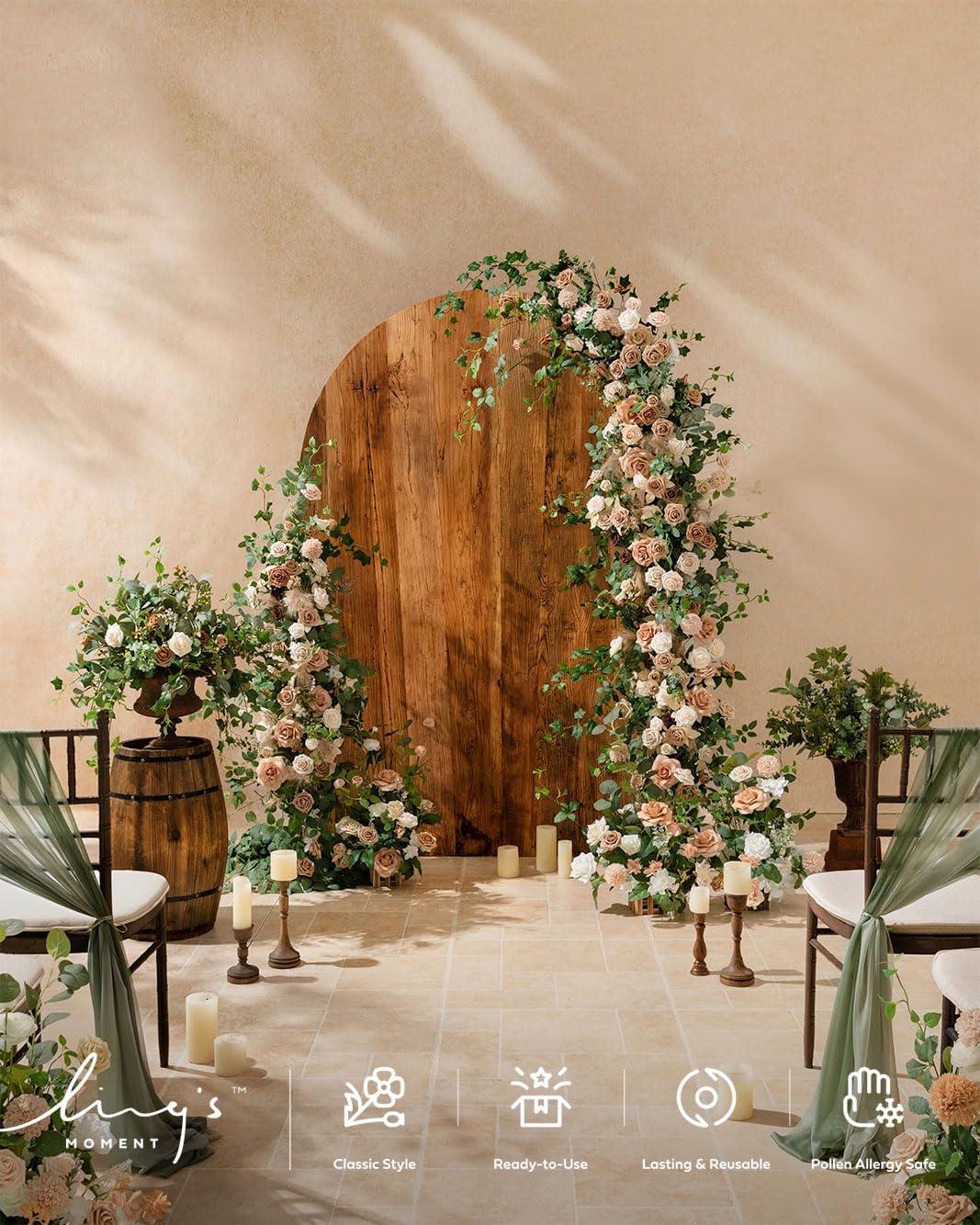 Size: Each flower swag is about 26″long x 22″ wide x 4.8″tall (after fluffed). Each flower garland is about 2 feet long. The aisle flower arrangements are 17.5″ in height and 10″ in width. The chair sash's size: 96″ L x 8″ W.