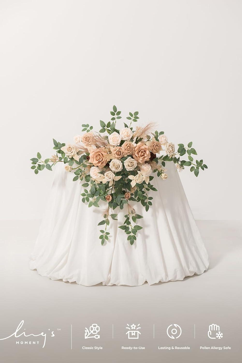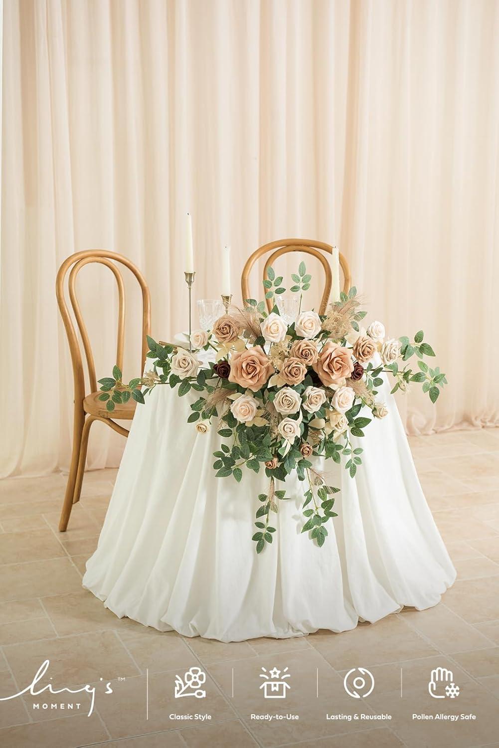 Floral Pile Centerpiece: This Floral arrangement is designed for Sweetheart/ Head table decor, and its floral pile is design-friendly for any other use, such as decor for bride and groom chair, simple arch, wedding car, home mirror, window, and garden gazebo. Available for recycling use after the wedding, very friendly to environmental protection.