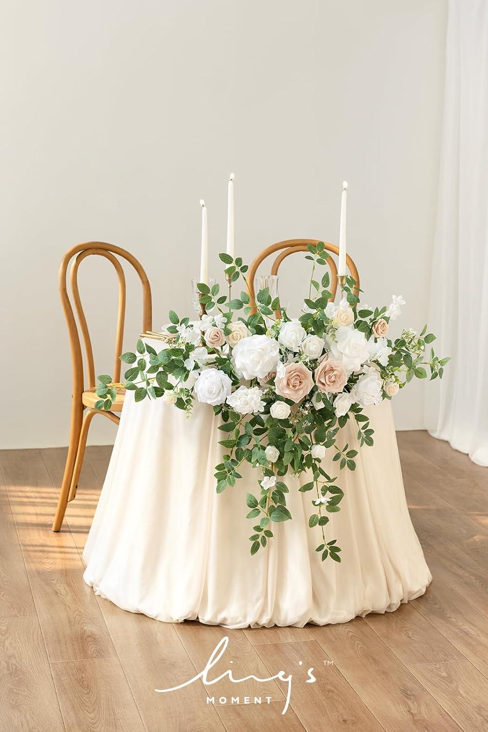 Floral Pile Centerpiece: This Floral arrangement is designed for Sweetheart/ Head table decor, and its floral pile is design-friendly for any other use, such as decor for bride and groom chair, simple arch, wedding car, home mirror, window, and garden gazebo. Available for recycling use after the wedding, very friendly to environmental protection.