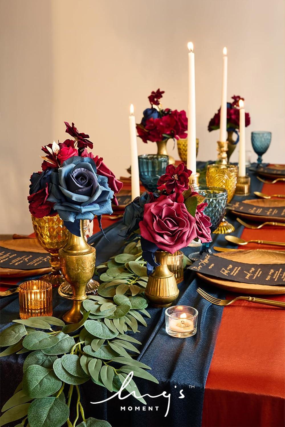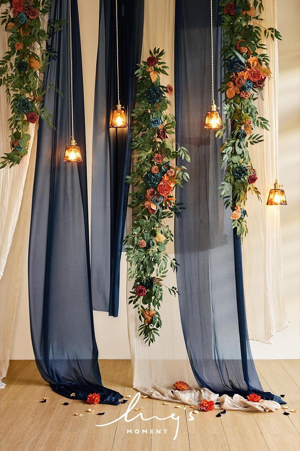 Package: 6ft teal orange flower garland x 1, Burgundy & Navy Centerptece x 6, 14ft navy blue table runner x 1