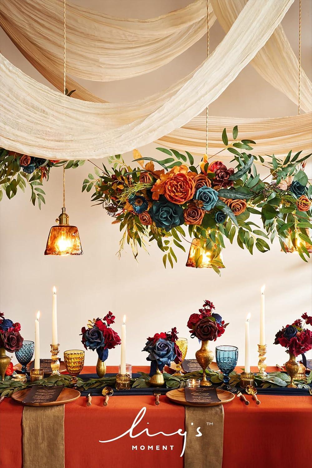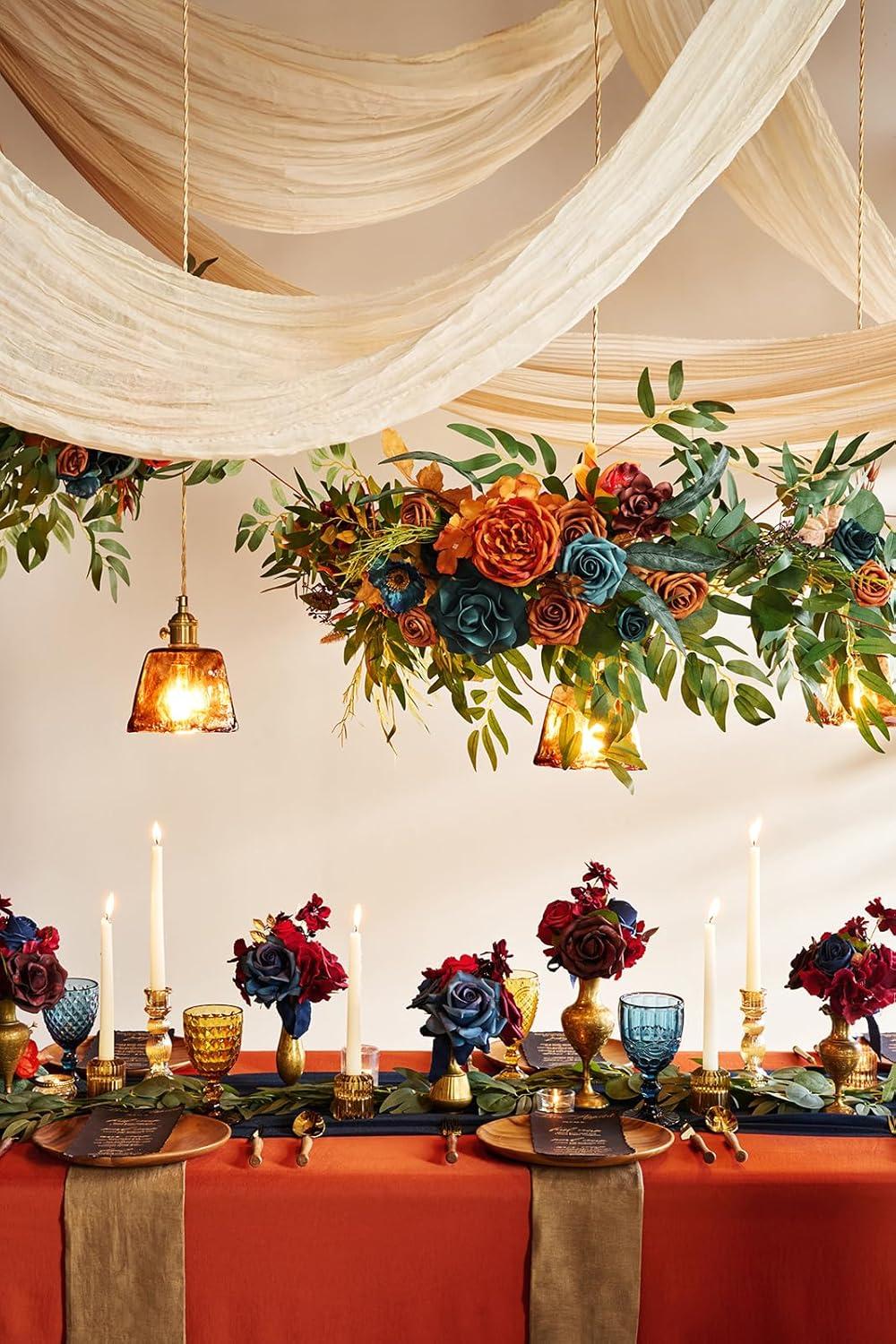 Size: Garland with a durable silk material in 6ft by 13.75″ wide and 3″tall (after fully stretched). The table runner is 29''W x 14FT. Each floral centerpiece measures 8″ tall by 5.2″ across.