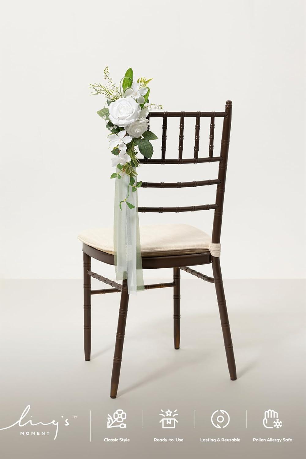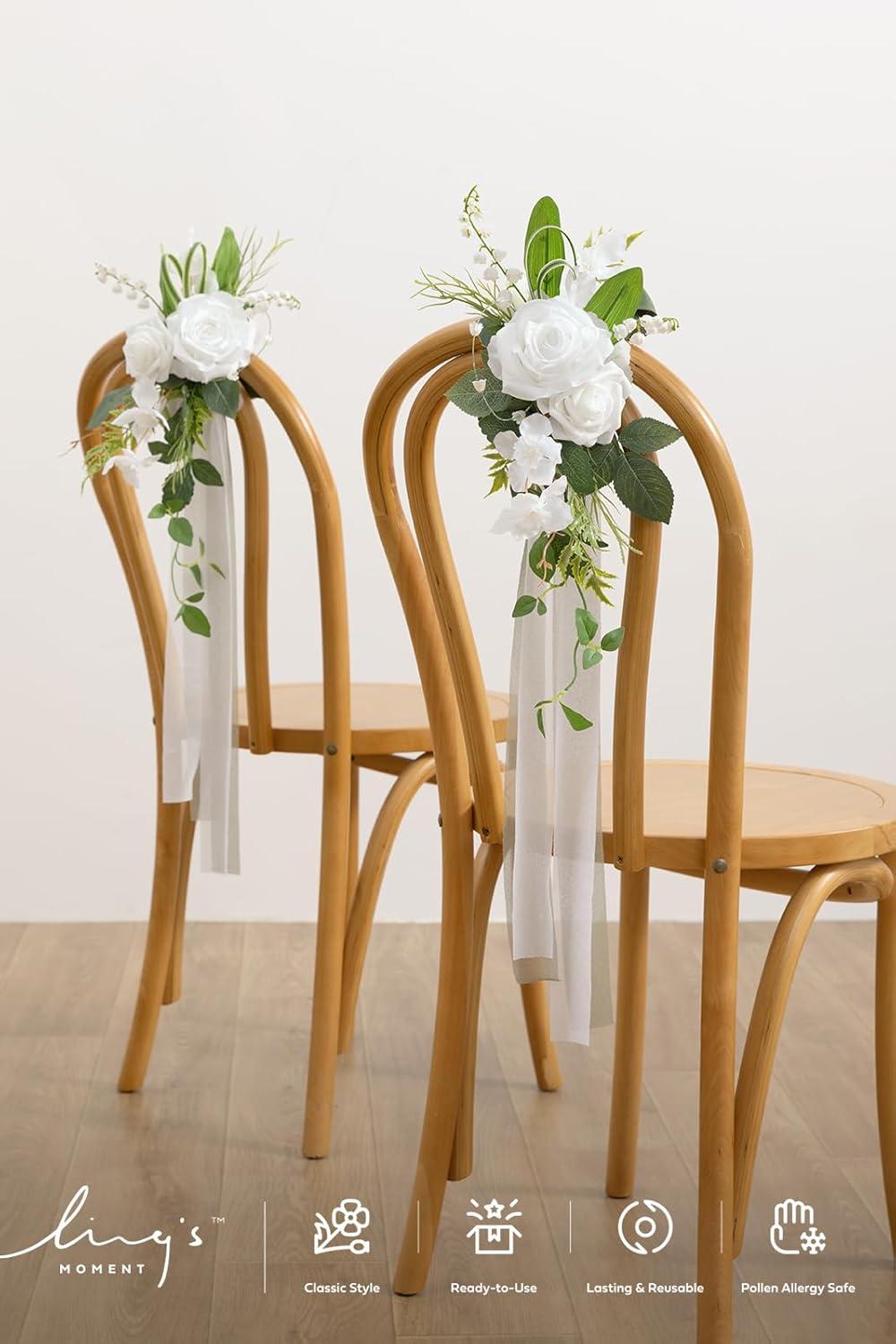 SUITABLE SIZE FOR CHAIRS: The wedding artificial chair flower decor is 13″ L x 5″ W, and the chair ribbon is 30″ long.