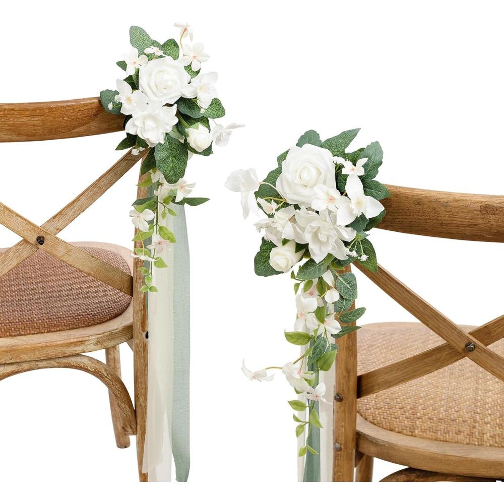 SUITABLE SIZE FOR CHAIRS: The wedding artificial chair flower decor is 13″ L x 5″ W, and the chair ribbon is 30″ long.