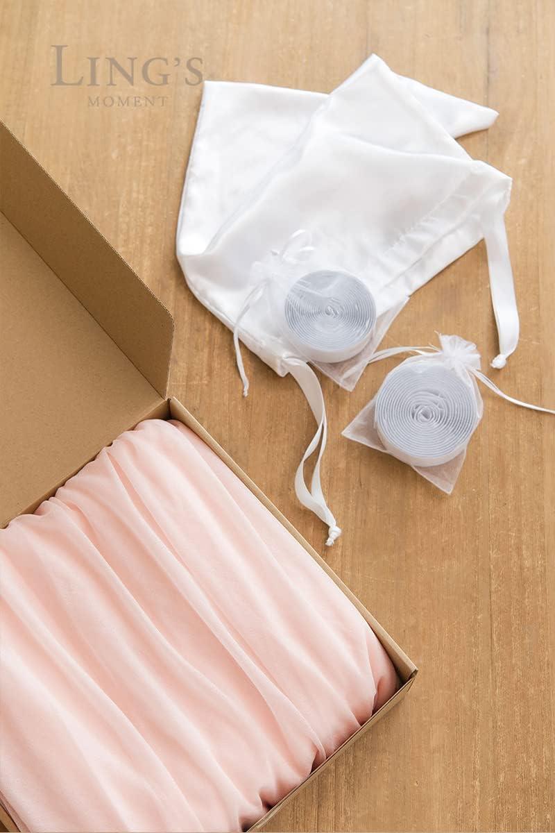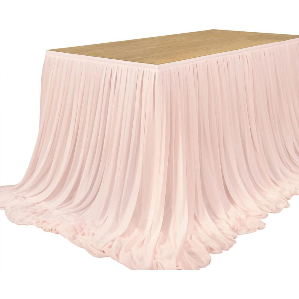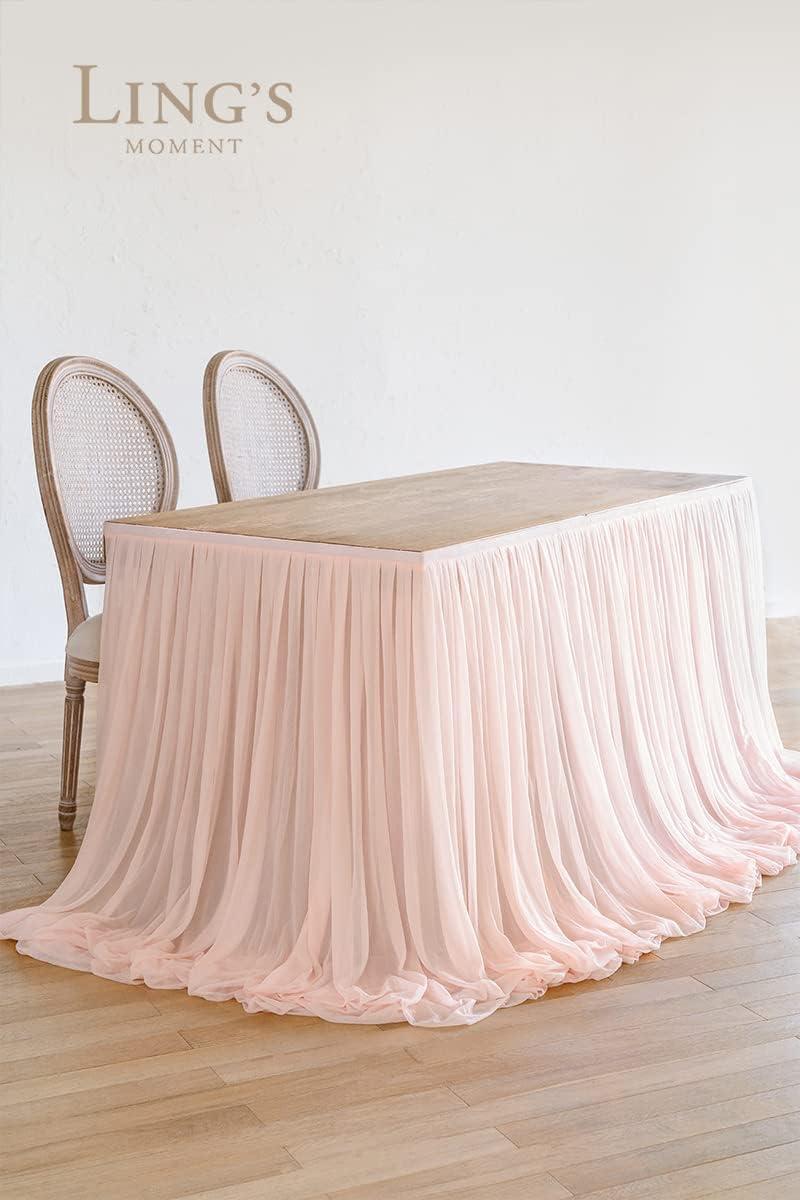 PREMIUM MATERIAL: 100% Polyester and the material of this fabric has a slight shimmer. It is made of 2 layers of Sheer Chiffon, makes the table skirt more textured, soft and smooth without ironing.