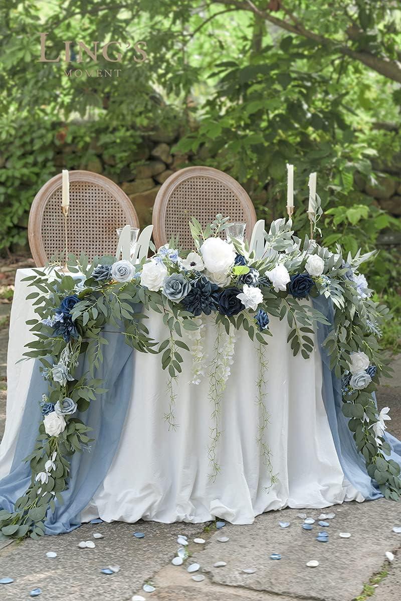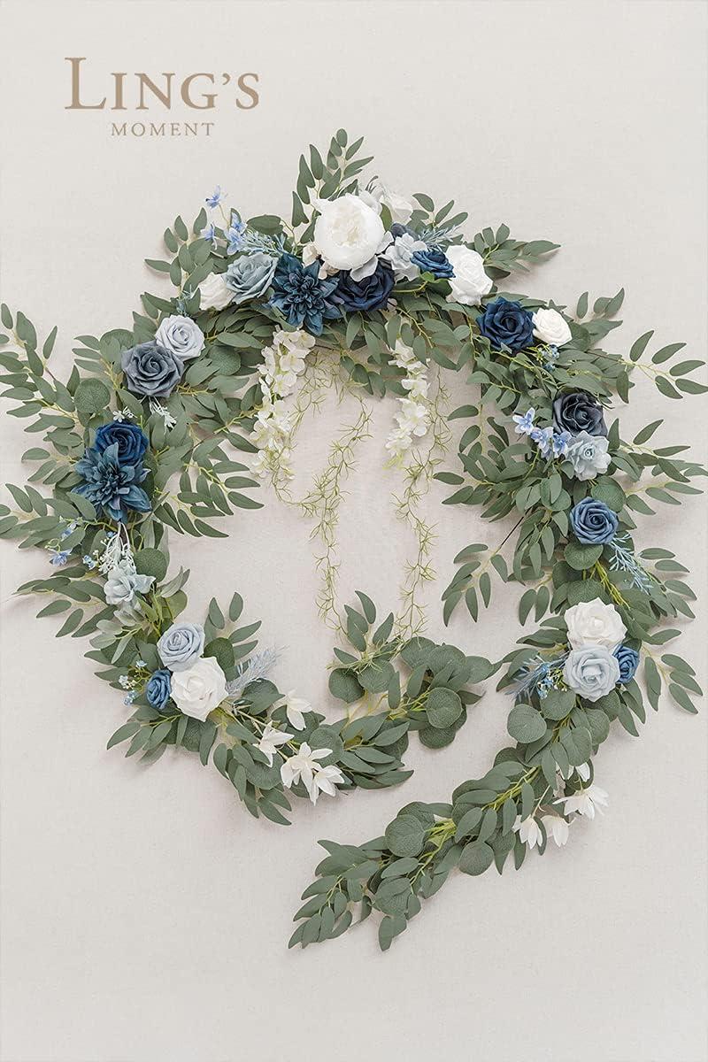 Ling's moment 9FT Christmas Flower Garland, Handcrafted Wedding Sweetheart Table Centerpieces Head Table Decor Arch Backdrop Decorations for Wedding | Gold(Blu-dusty Blue & Navy)
