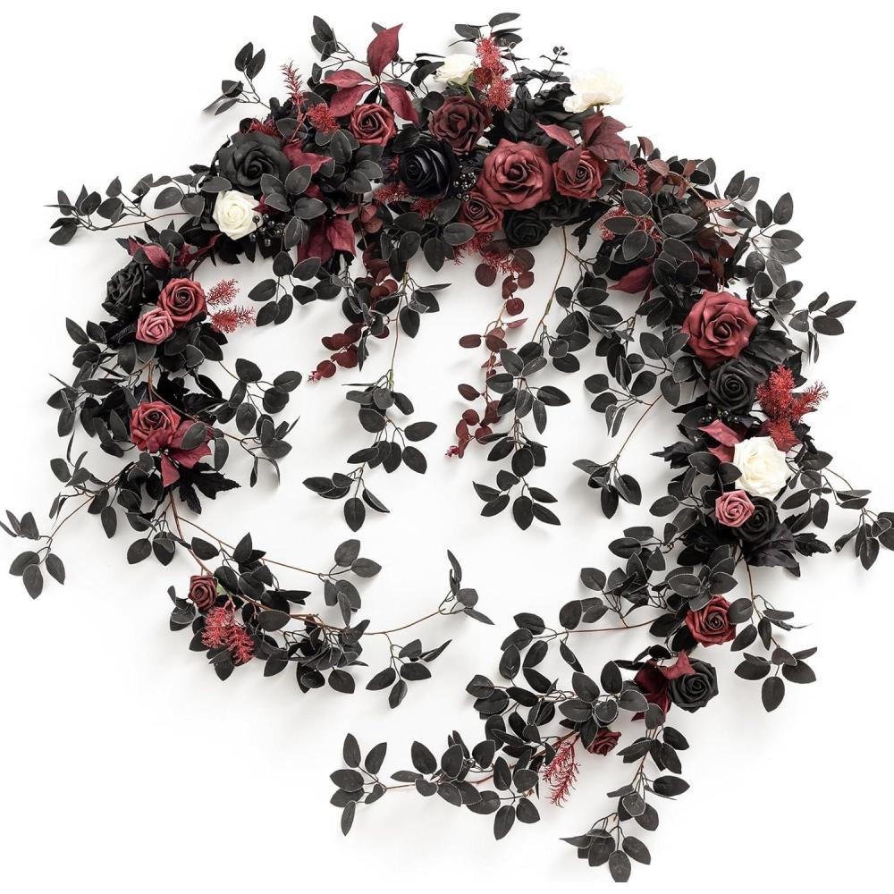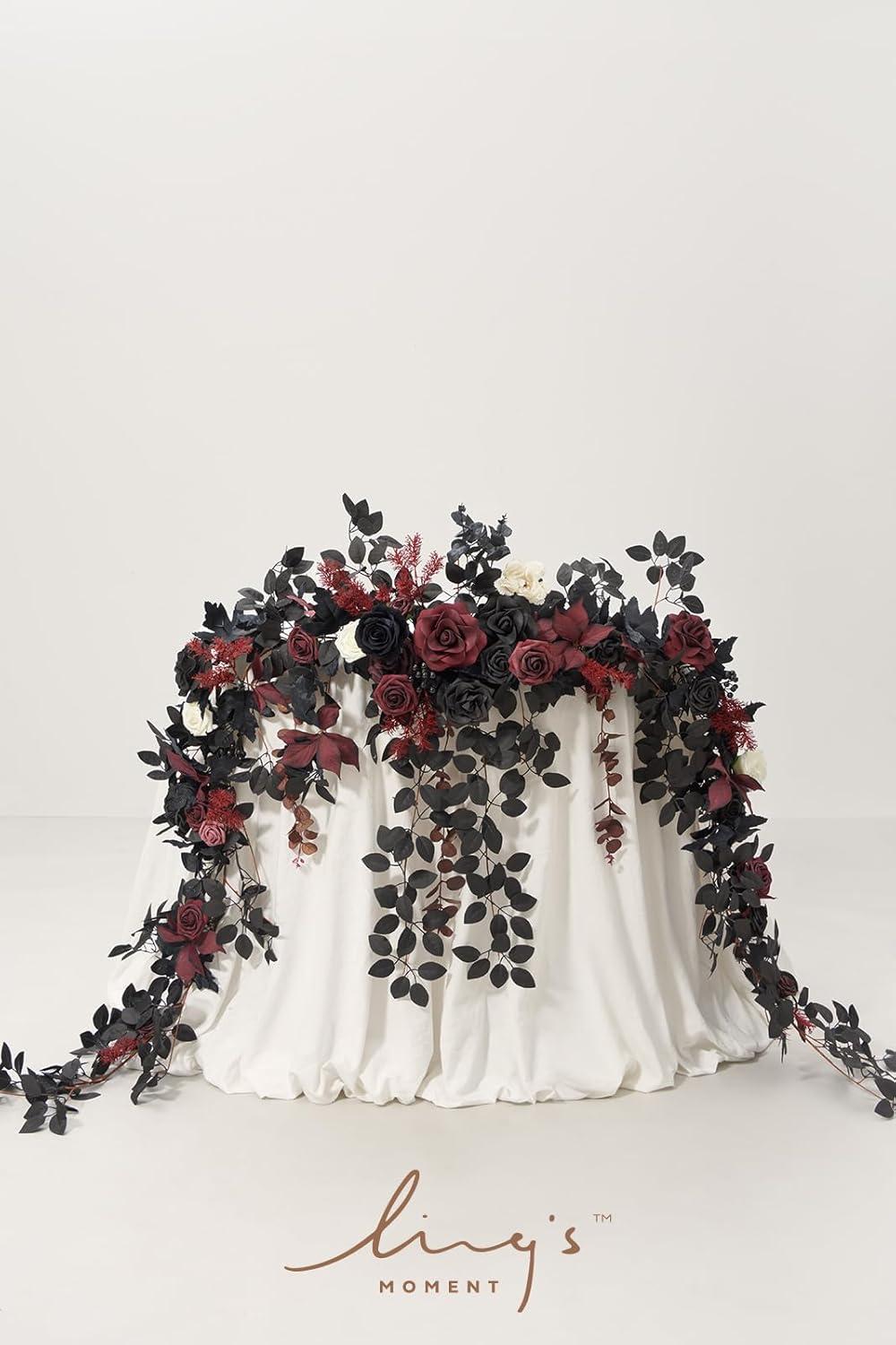 Ling's moment 9FT Christmas Flower Garland, Handcrafted Wedding Sweetheart Table Centerpieces Head Table Decor Arch Backdrop Decorations for Wedding | Gold(Red-moody Burgundy & Black)