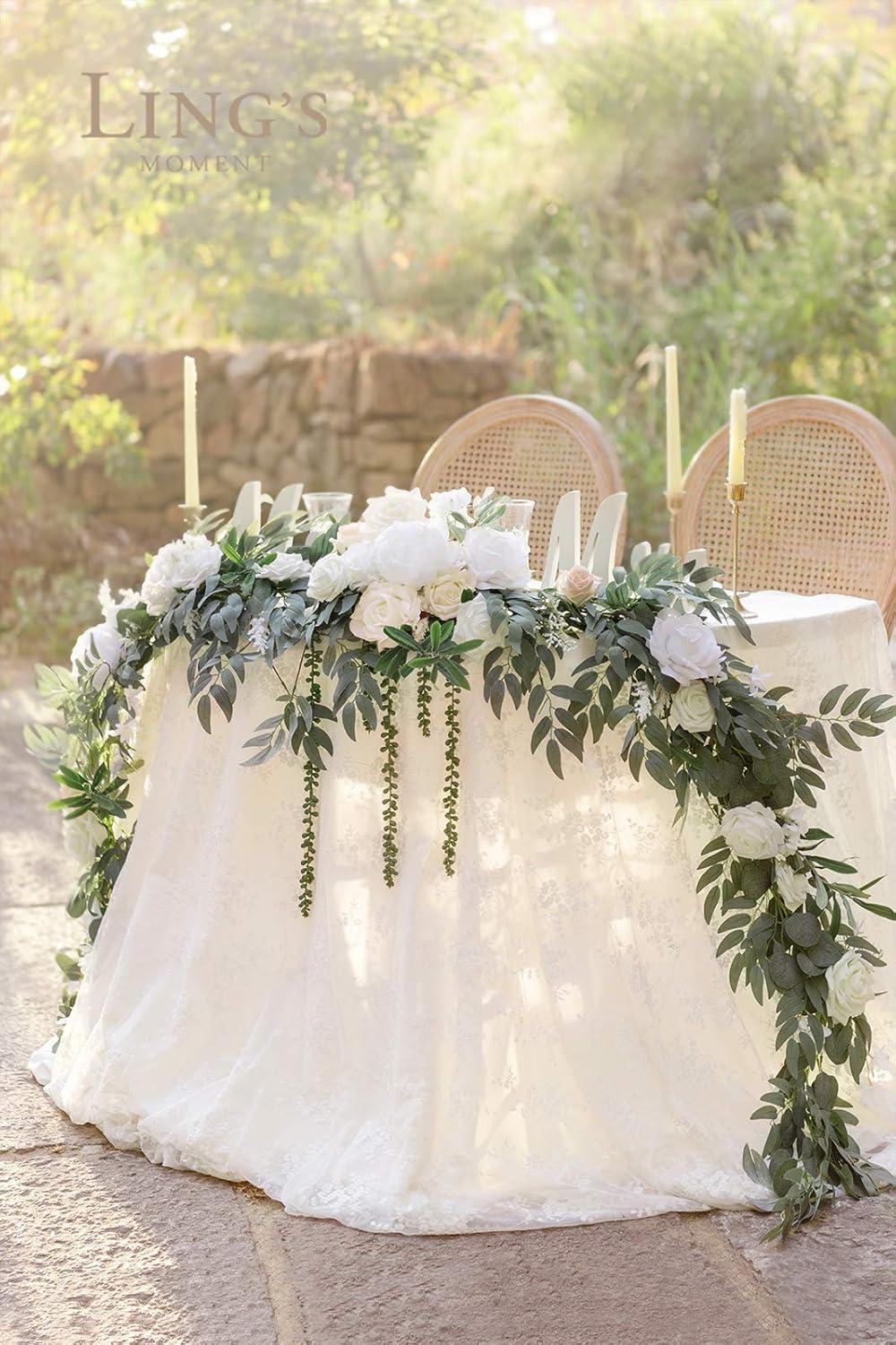 Suitable for a 4ft long sweetheart table: fuller flowers center part on the table, and 2ft garland hanging down on both sides. Or Suitable for 8-9FT head table (using 1 garland), or 24FT spice long guest table (using 3 garlands).
