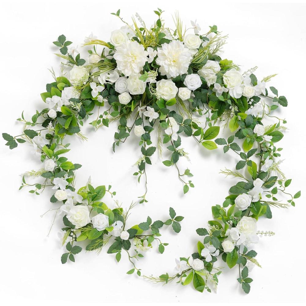 Suitable for a 4ft long sweetheart table: fuller flowers center part on the table, and 2ft garland hanging down on both sides. Or Suitable for 8-9FT head table (using 1 garland), or 24FT spice long guest table (using 3 garlands).