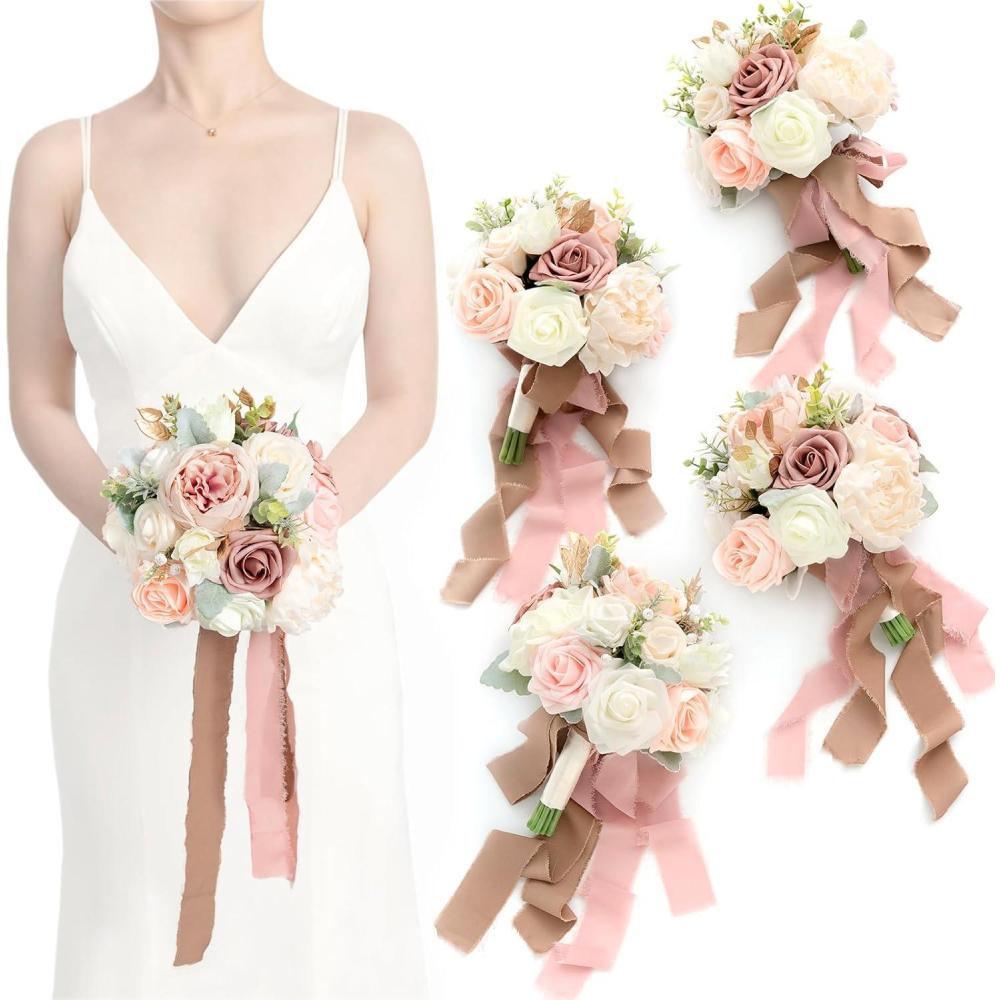 Ling’s moment Artificial Bridesmaid Bouquets Set of 4,Marsala Wedding Flower Bouquets White Floral Bouquet Blush Bridal Bouquets with Ribbon,Ceremony,Anniversary,7-inch Diameter(Pk-dusty Rose & Gold)