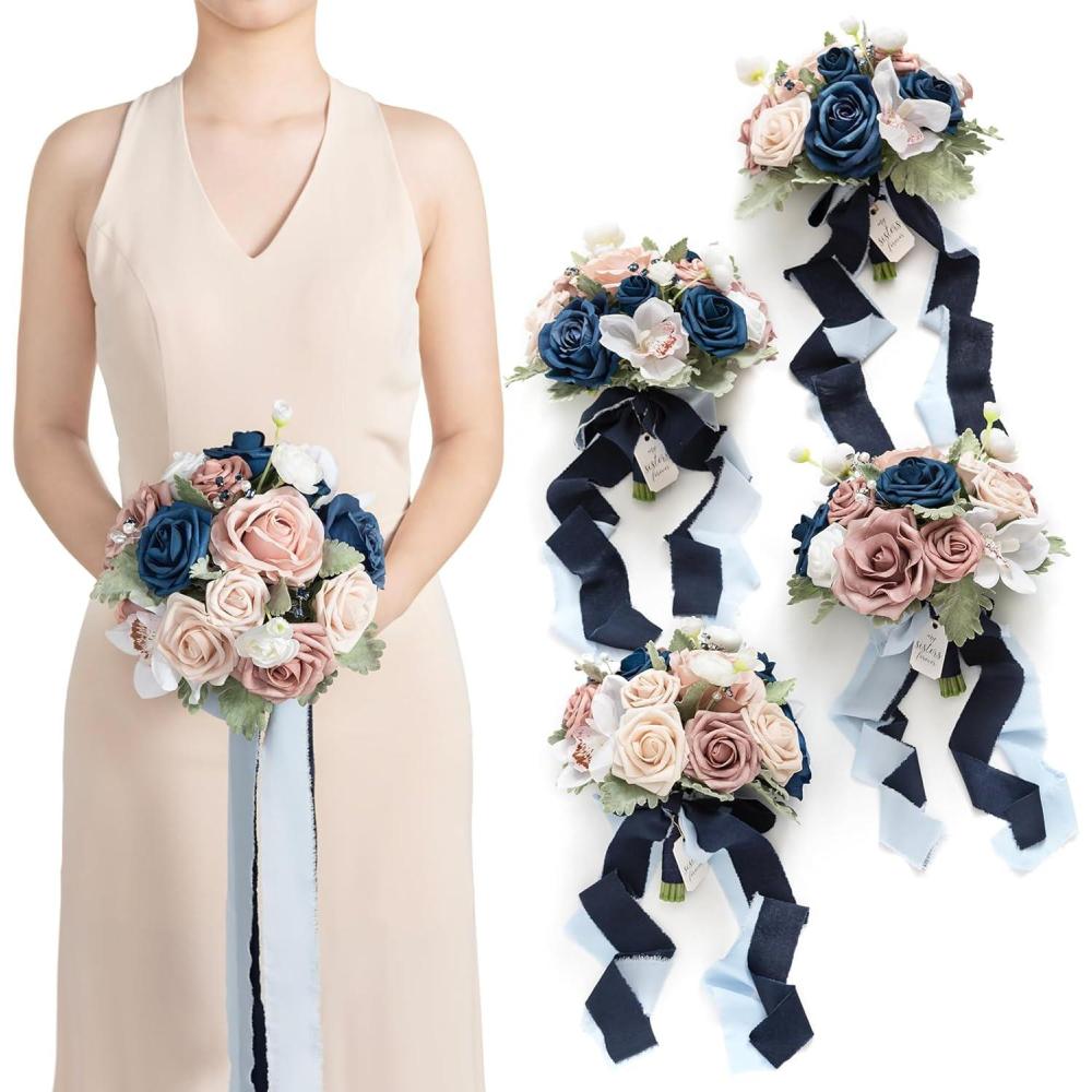 Ling’s moment Artificial Bridesmaid Bouquets Set of 4,Marsala Wedding Flower Bouquets White Floral Bouquet Blush Bridal Bouquets with Ribbon,Ceremony,Anniversary,7-inch Diameter(Pk-dusty Rose & Navy)