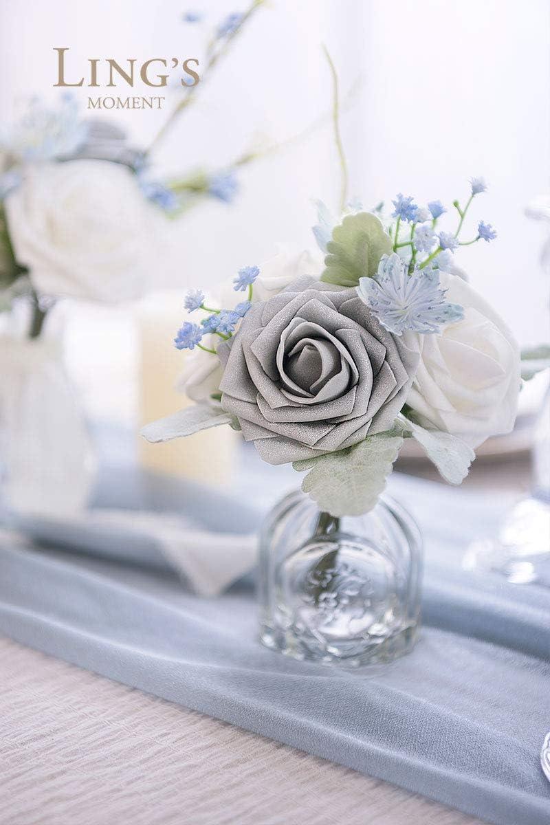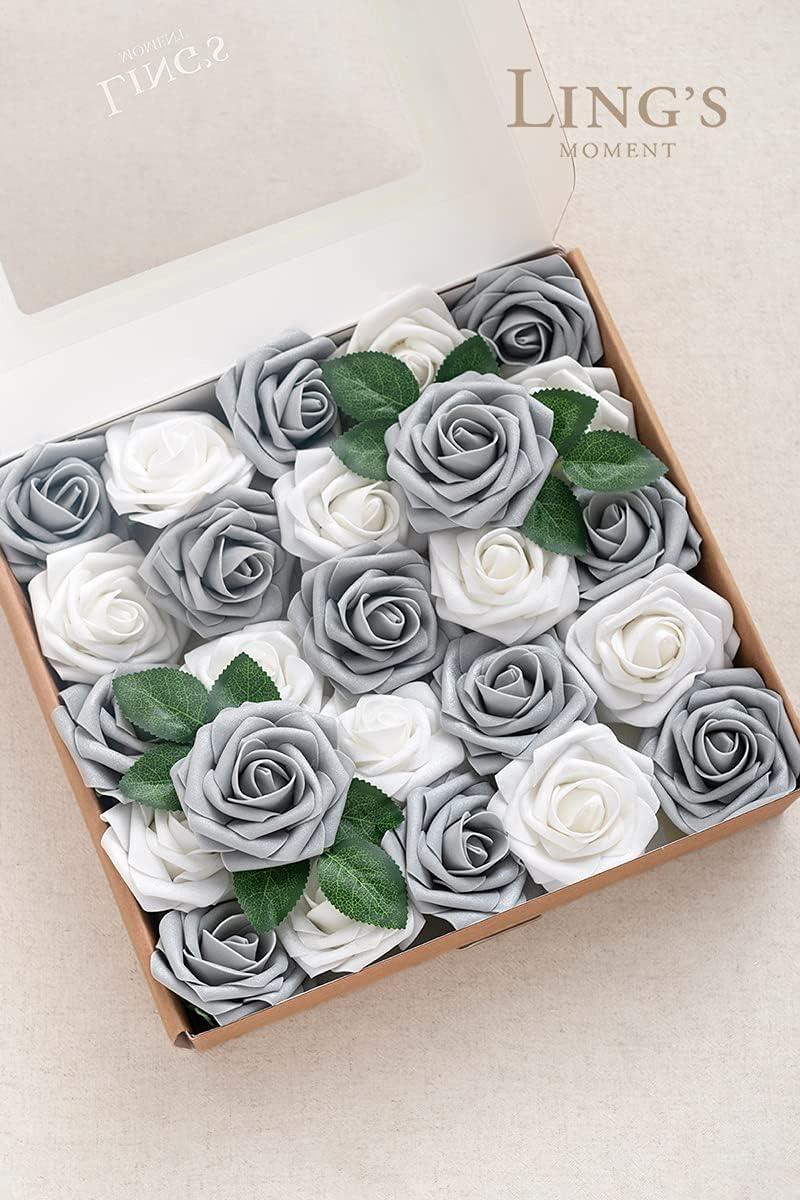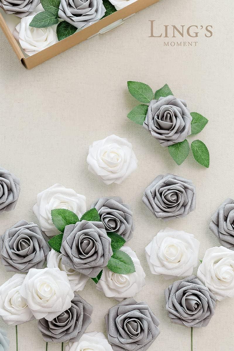 Ling’s Moment Artificial Flowers 25Pcs Mauve Plum Roses Decor w/Stems,3″ Real Touch DIY Foam Floral for Wedding Bouquet/Centerpieces, Outdoors Party Backdrop, Room/Table, and Garden/Pot Decorations(Slv- Shimmer Silver Grey & White)