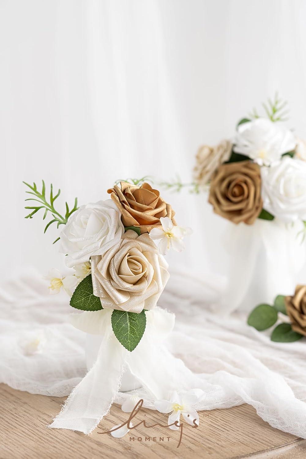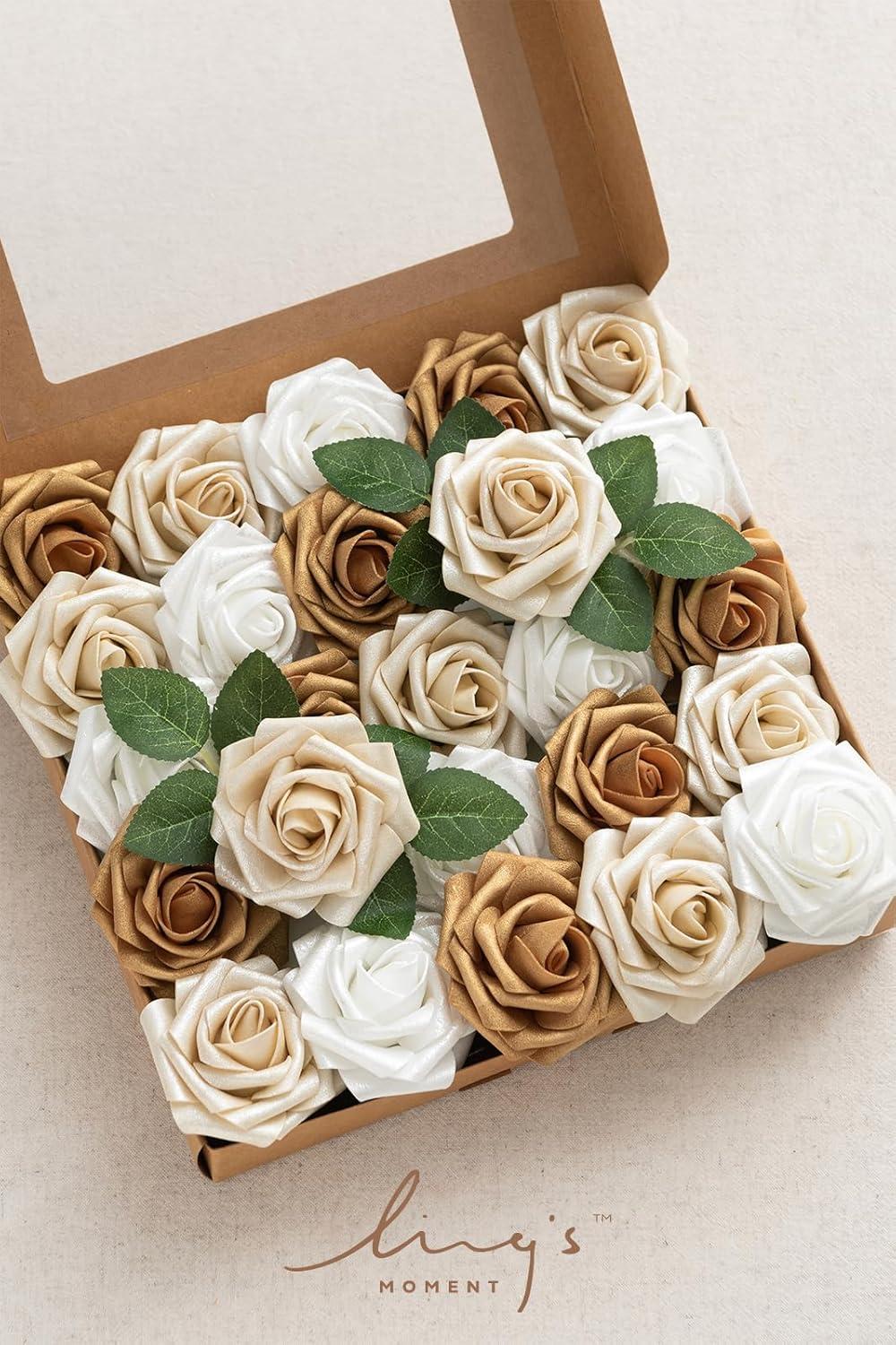 Ling’s Moment Artificial Flowers 25Pcs Mauve Plum Roses Decor w/Stems,3″ Real Touch DIY Foam Floral for Wedding Bouquet/Centerpieces, Outdoors Party Backdrop, Room/Table, and Garden/Pot Decorations(Wht- Gold & White)