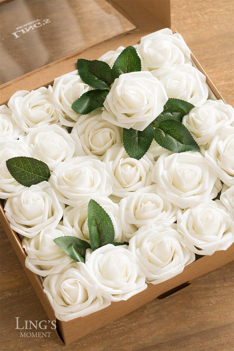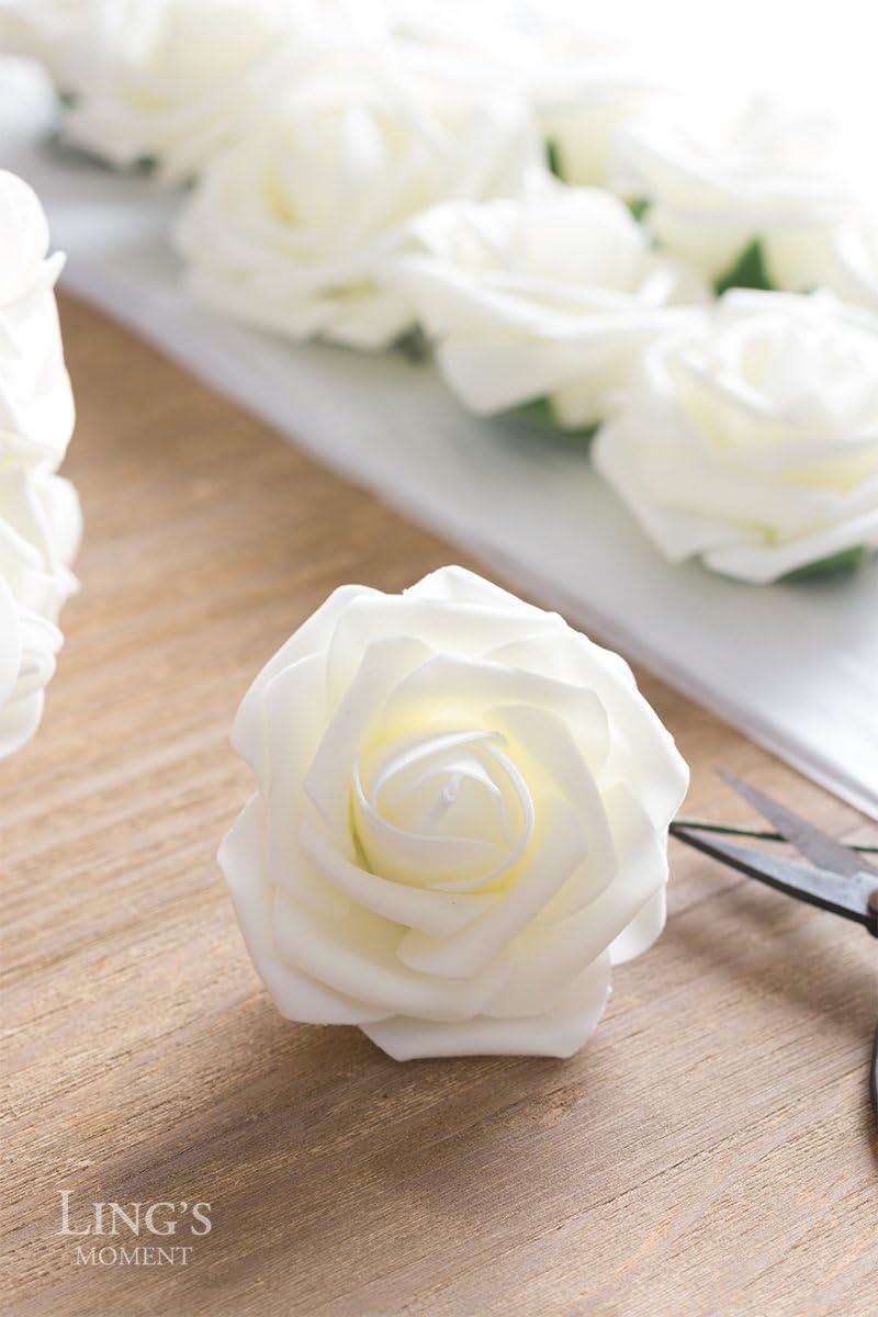 Ling’s Moment Artificial Flowers 25Pcs Mauve Plum Roses Decor w/Stems,3″ Real Touch DIY Foam Floral for Wedding Bouquet/Centerpieces, Outdoors Party Backdrop, Room/Table, and Garden/Pot Decorations(Wht- Ivory)