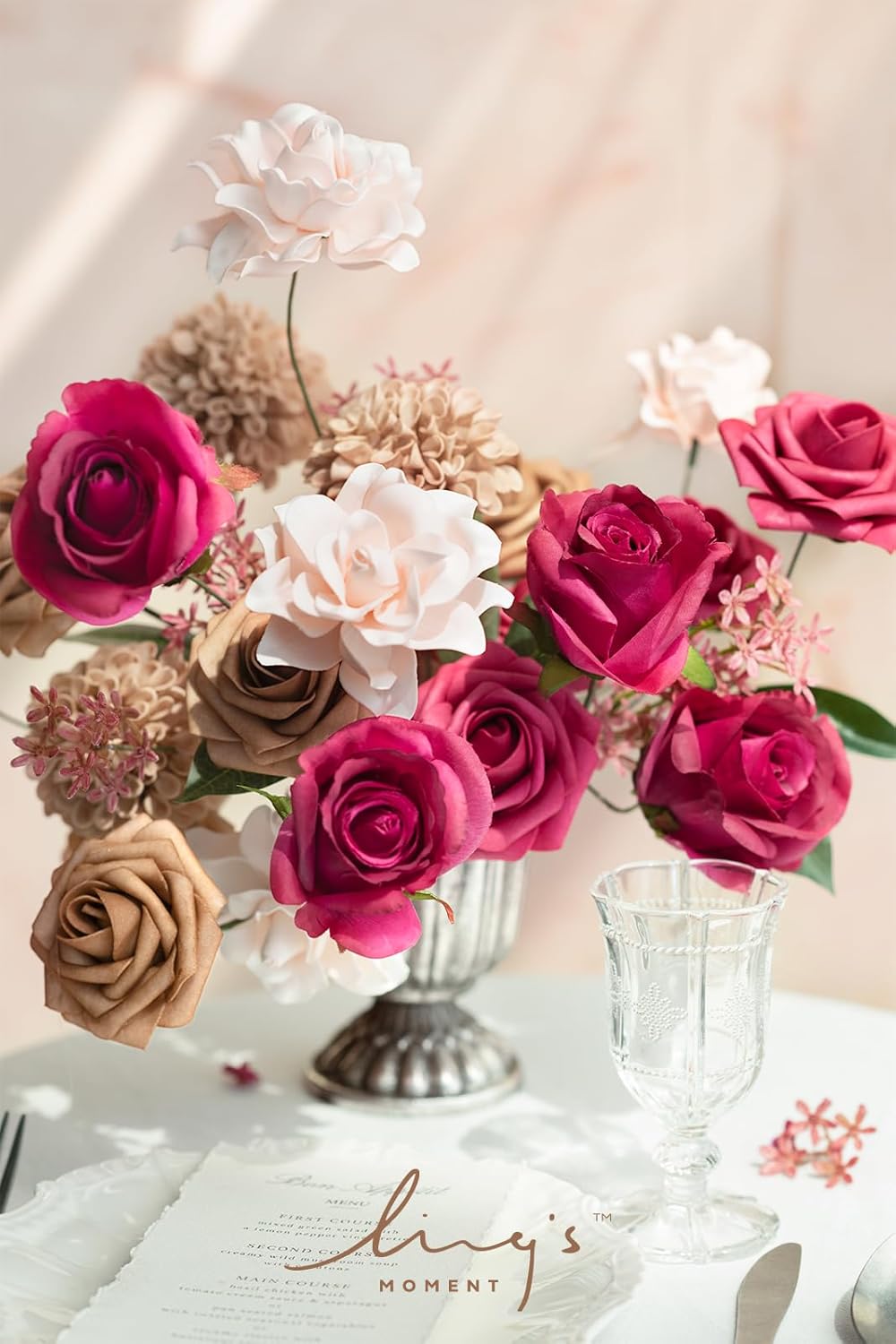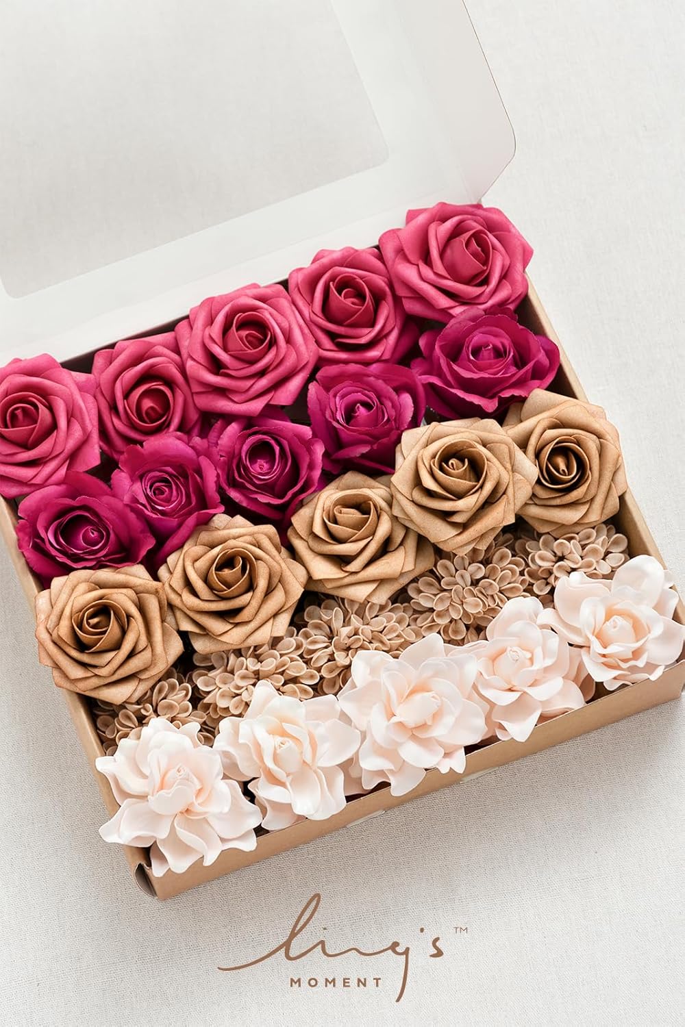 Package Include: Cinnamon Rose Foam Mini Rose x8, Torrid Blush Foam Rose x5, Pink Cedar Silk Rose x4, Morandi Peach Foam Rose x4, Nude Foam Rose x5.