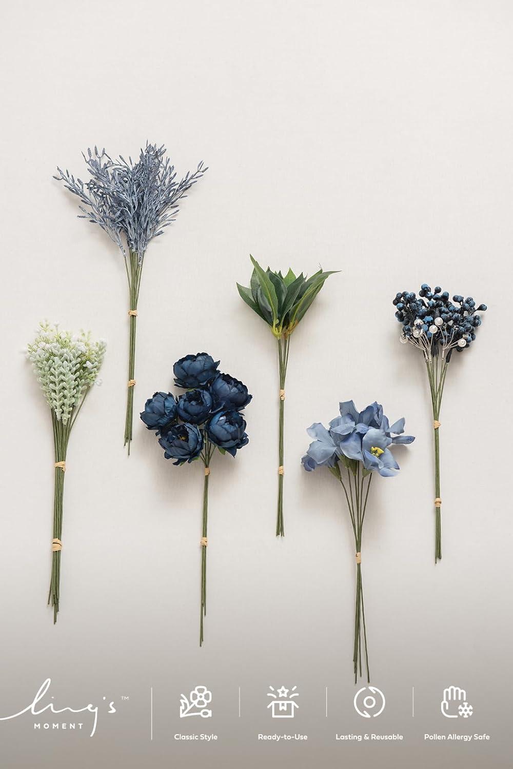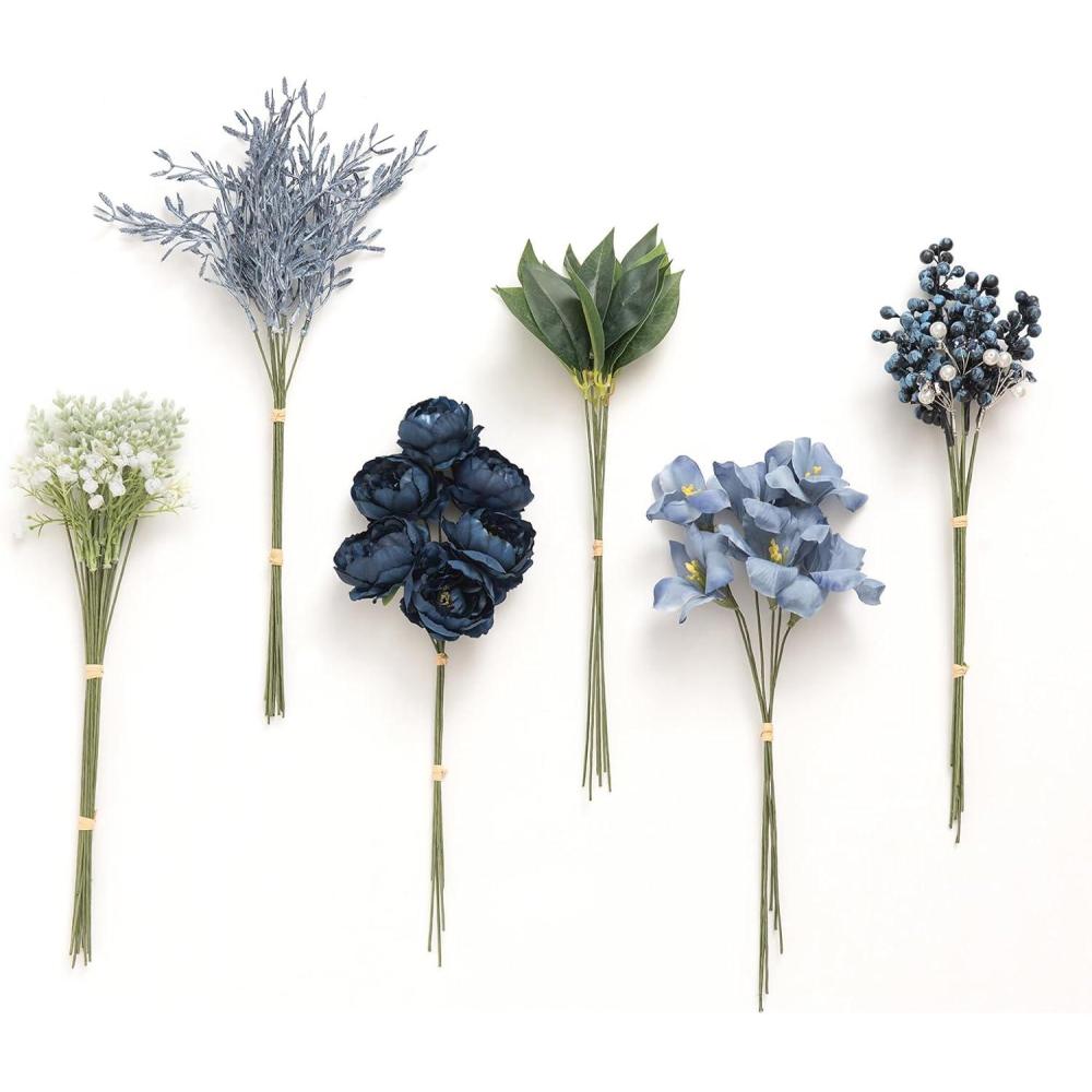 Ling's moment Artificial Greenery Stems Box Set, 48pcs with 7 Kinds of Faux Greenery Picks for DIY Bridal Bouquets Wedding Floral Arrangement Table Centerpieces, Tawny Beige & Sand Beige(Blu-dark Green & Navy)