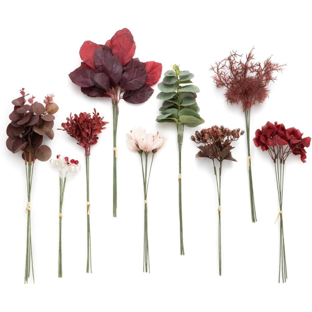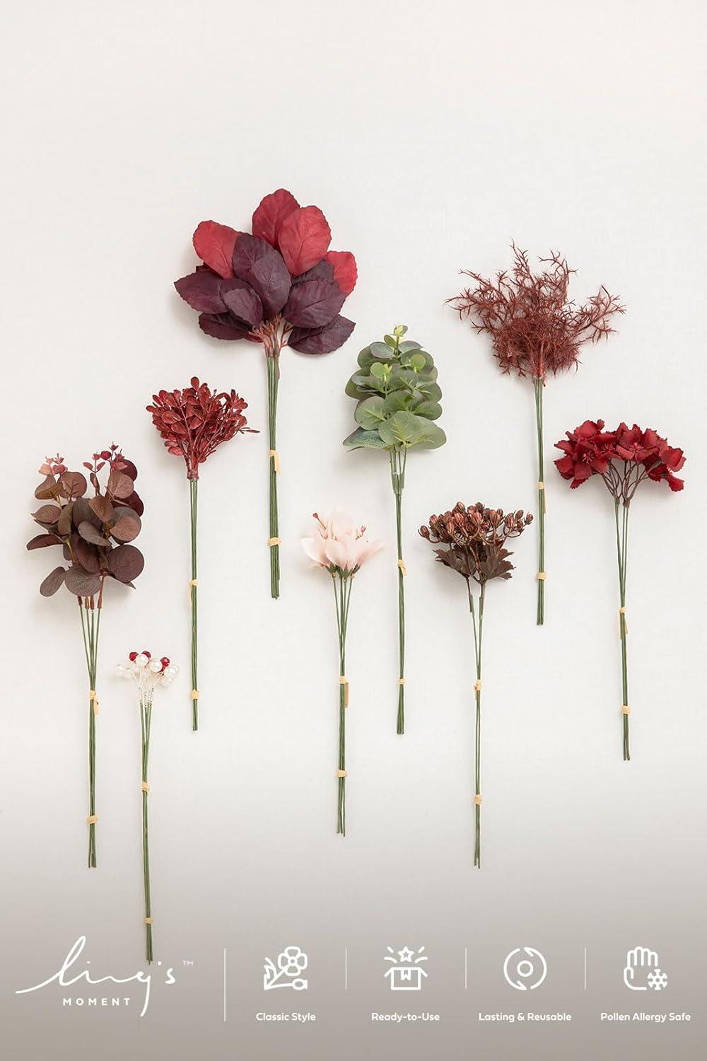 Ling’s moment Artificial Greenery Stems Box Set, 48pcs with 7 Kinds of Faux Greenery Picks for DIY Bridal Bouquets Wedding Floral Arrangement Table Centerpieces, Tawny Beige & Sand Beige(Red-bordeaux Red)