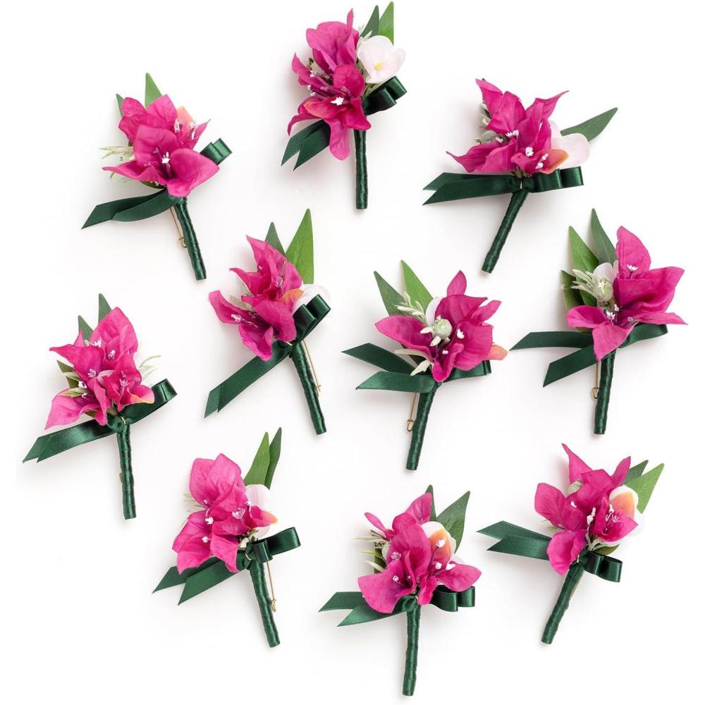 Ling's moment Boutonniere for Men, 10pcs Groomsmen Guest Boutonniere, Artificial Flowers for Wedding Décor/Prom/Homecoming,etc.Black Baccara Burgundy(PK-Hot Pink & magenta Blush)