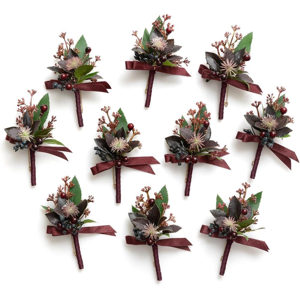 Ling’s moment Boutonniere for Men, 10pcs Groomsmen Guest Boutonniere, Artificial Flowers for Wedding Décor/Prom/Homecoming,etc.Black Baccara Burgundy(WHT-White & Lily Valley)
