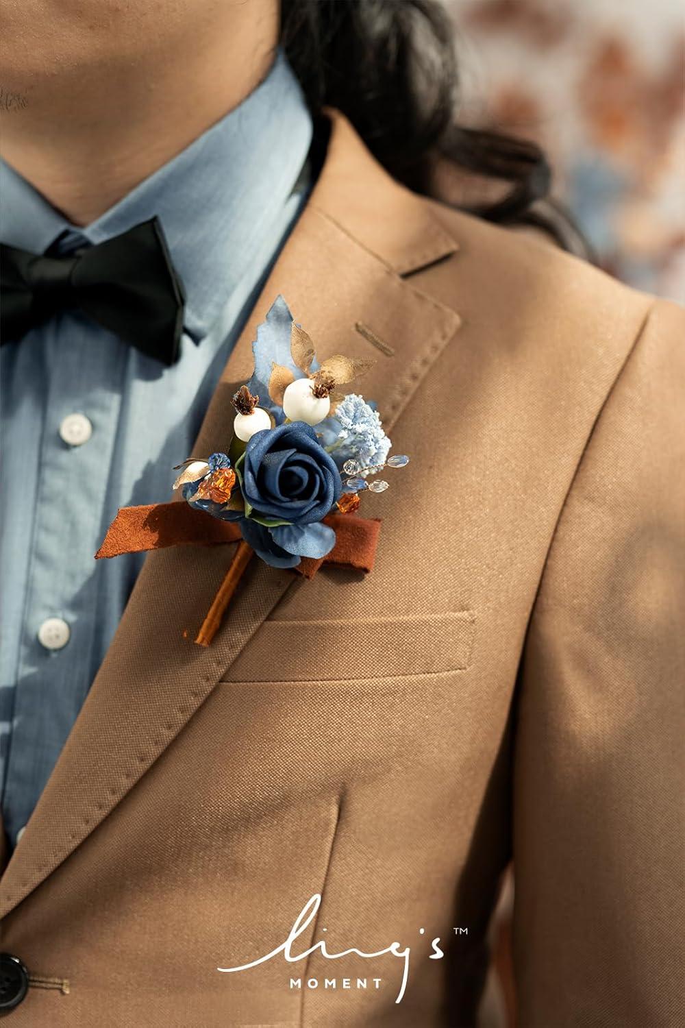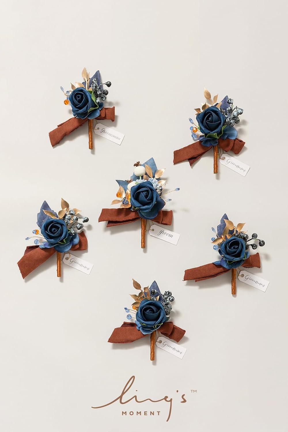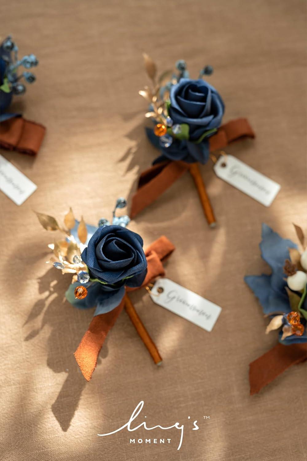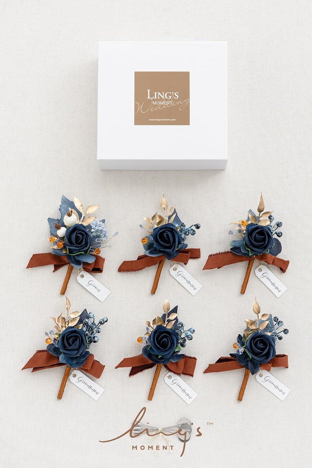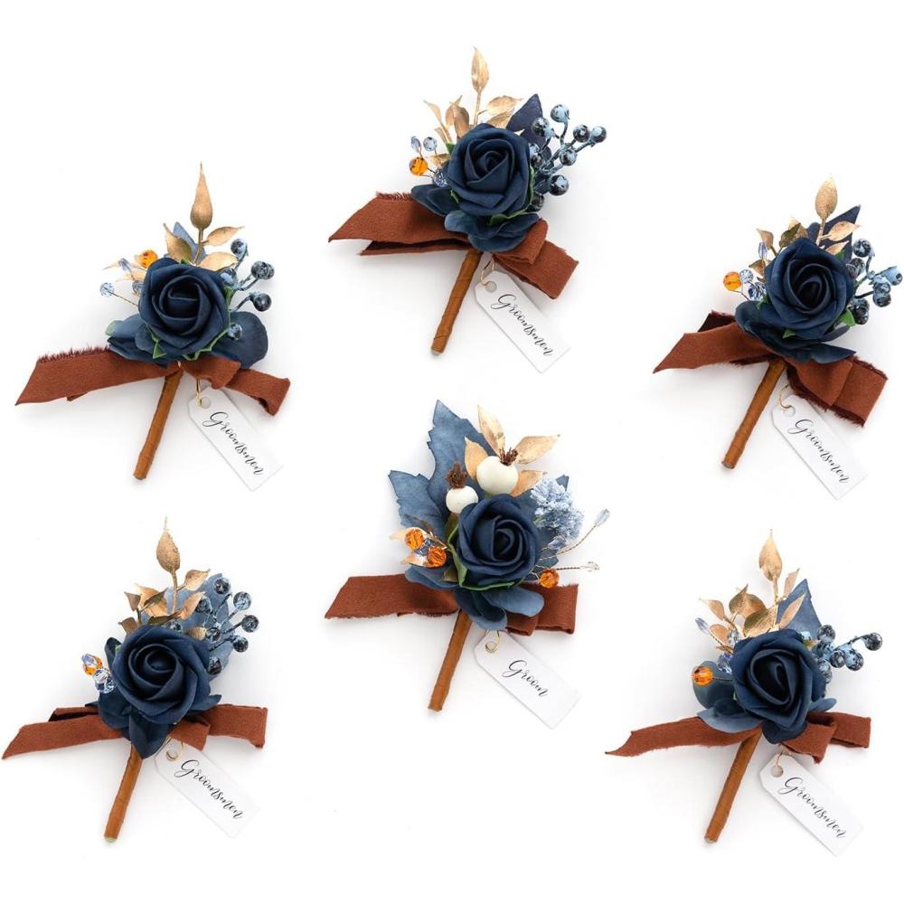 Ling's moment Boutonniere for Men, 6pcs Groom Groomsmen Boutonniere, Artificial Flowers for Wedding Decor/Prom/Homecoming, etc.Sand Beige White(Blu-burnt Orange & Navy Blue)