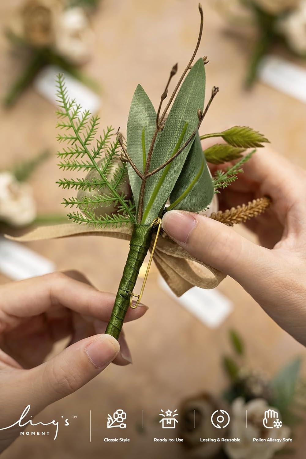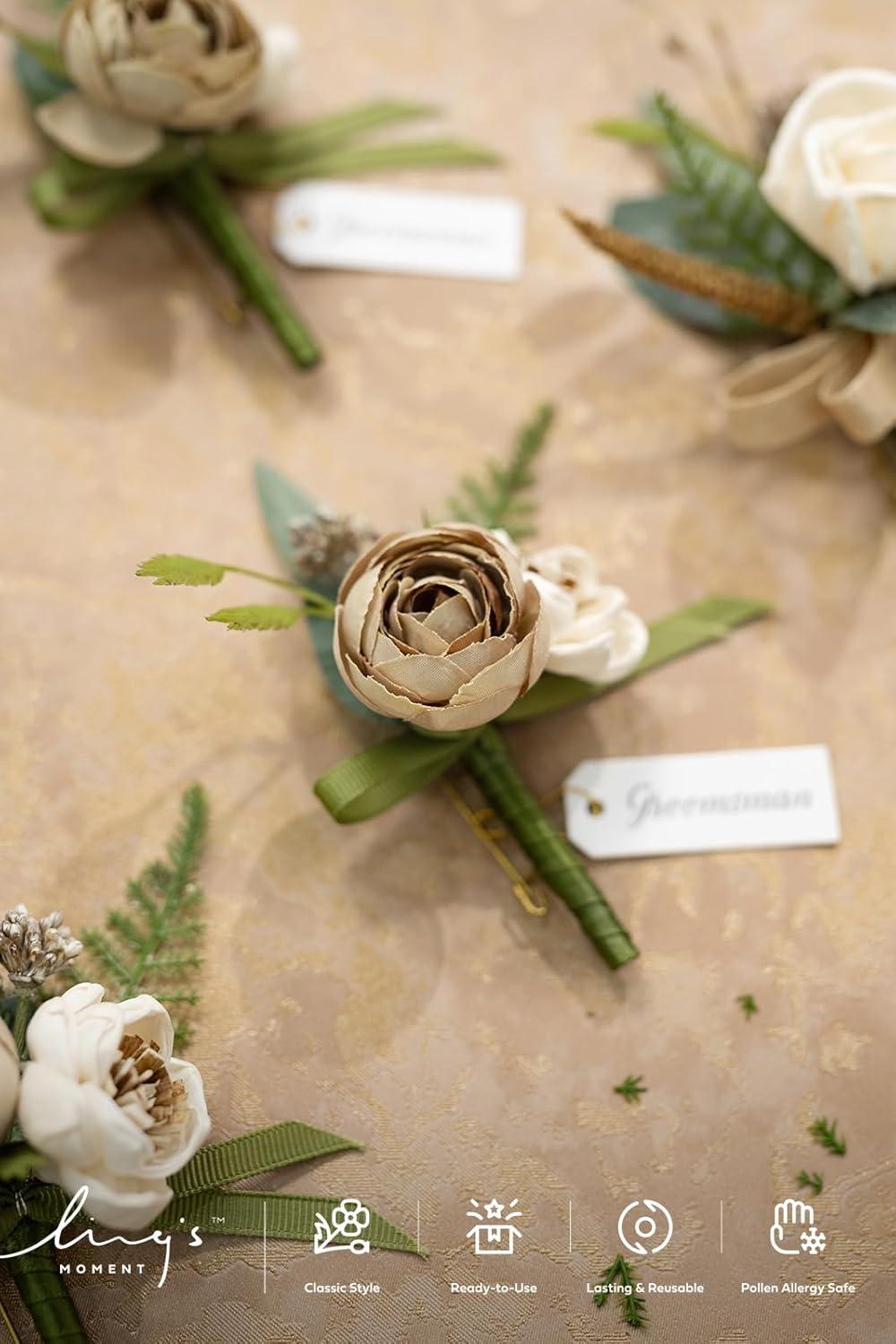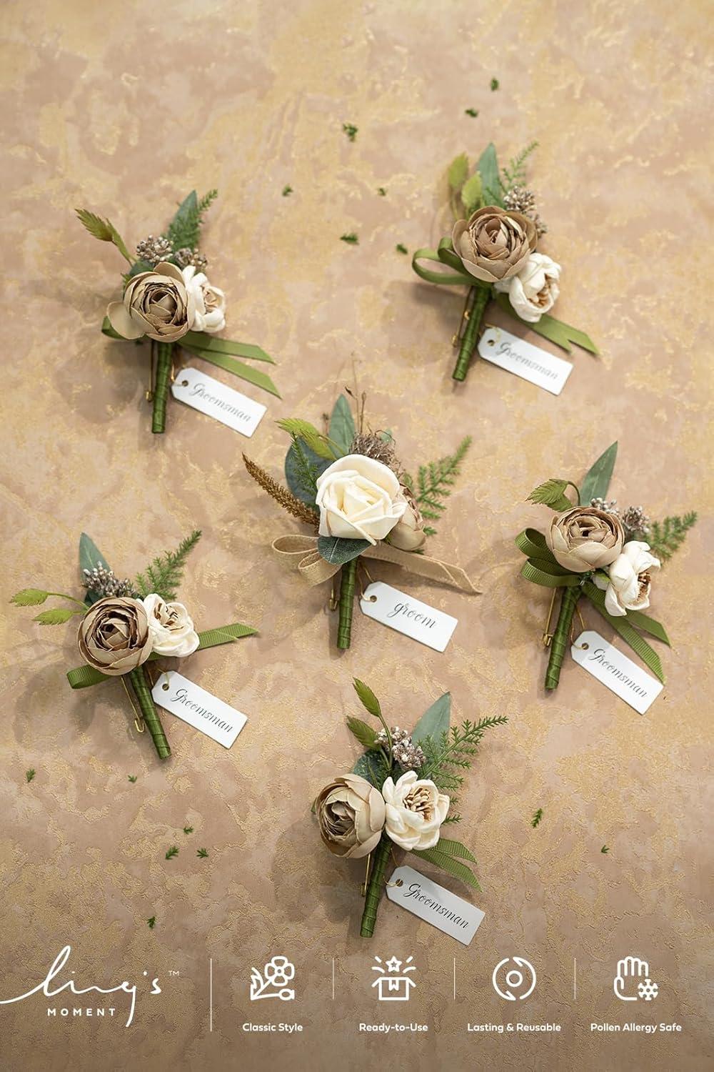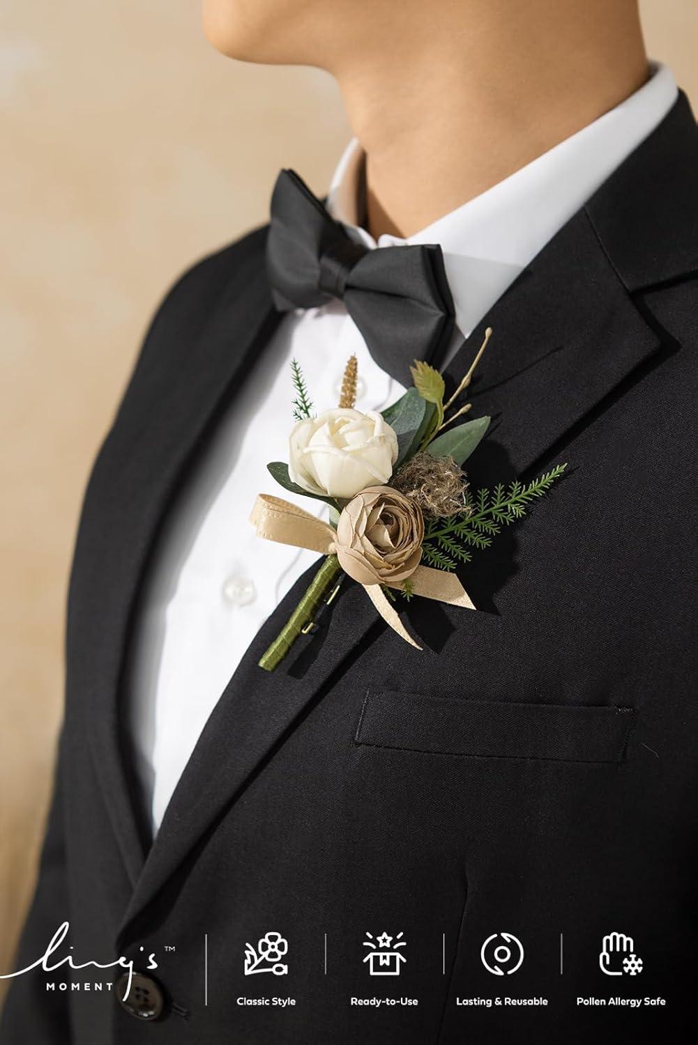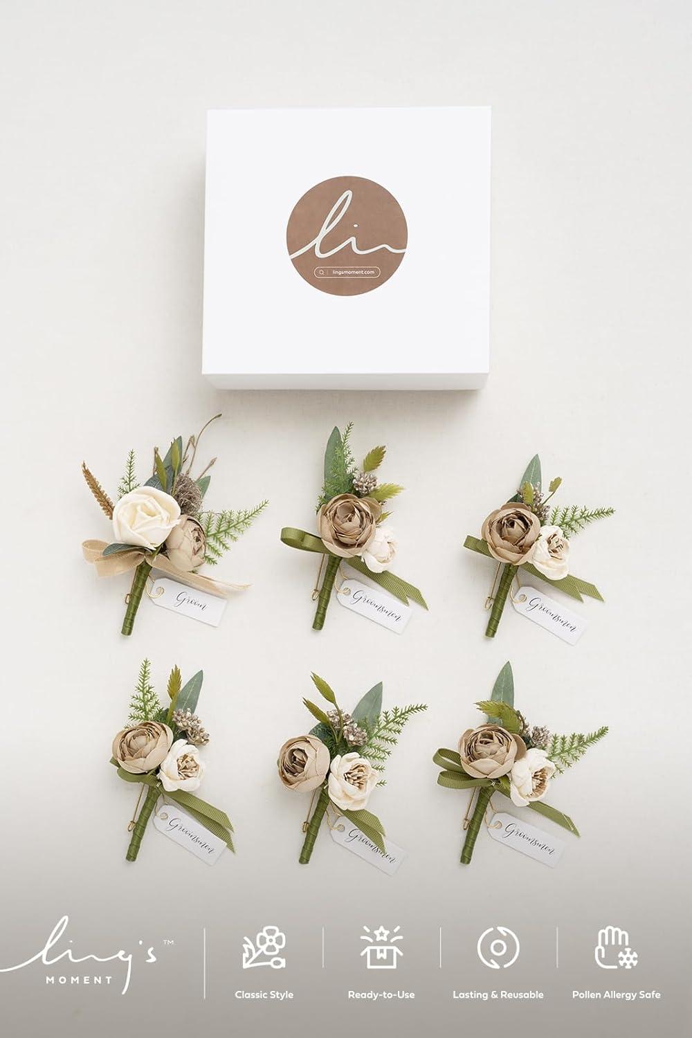 Ling’s moment Boutonniere for Men, 6pcs Groom Groomsmen Boutonniere, Artificial Flowers for Wedding Decor/Prom/Homecoming, etc.Sand Beige White(Brn-brown)