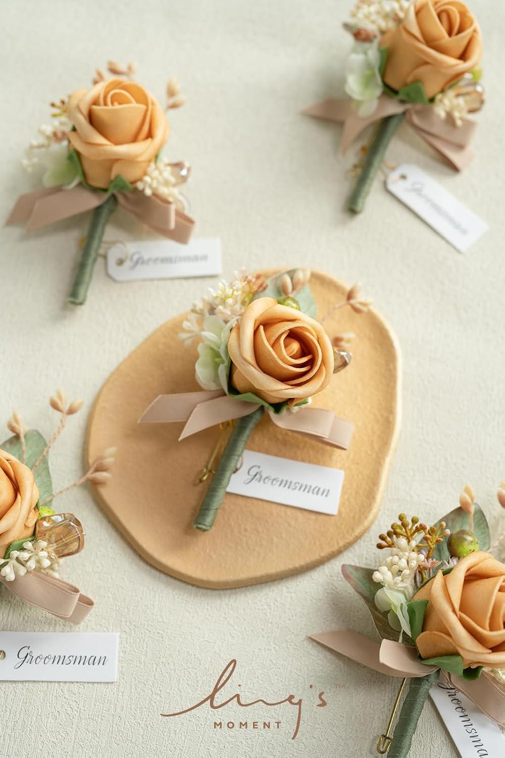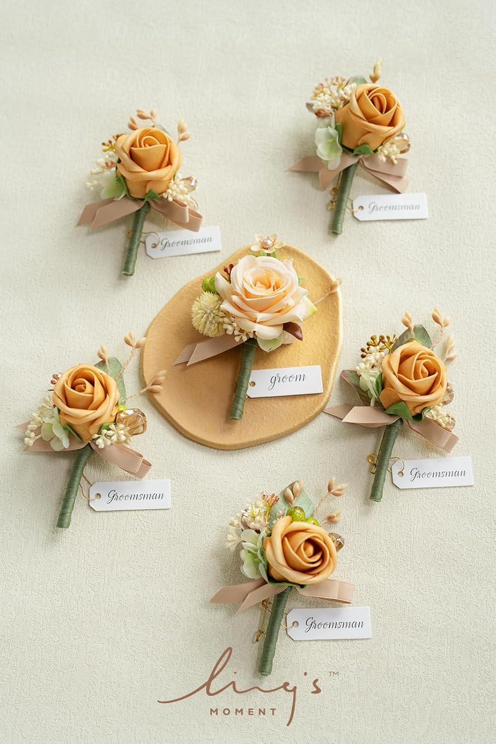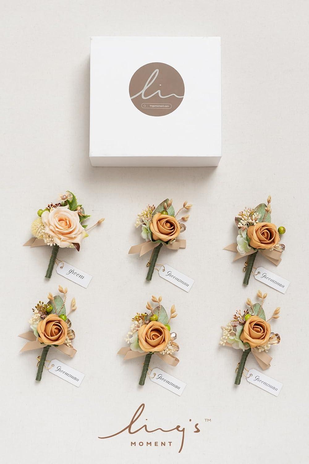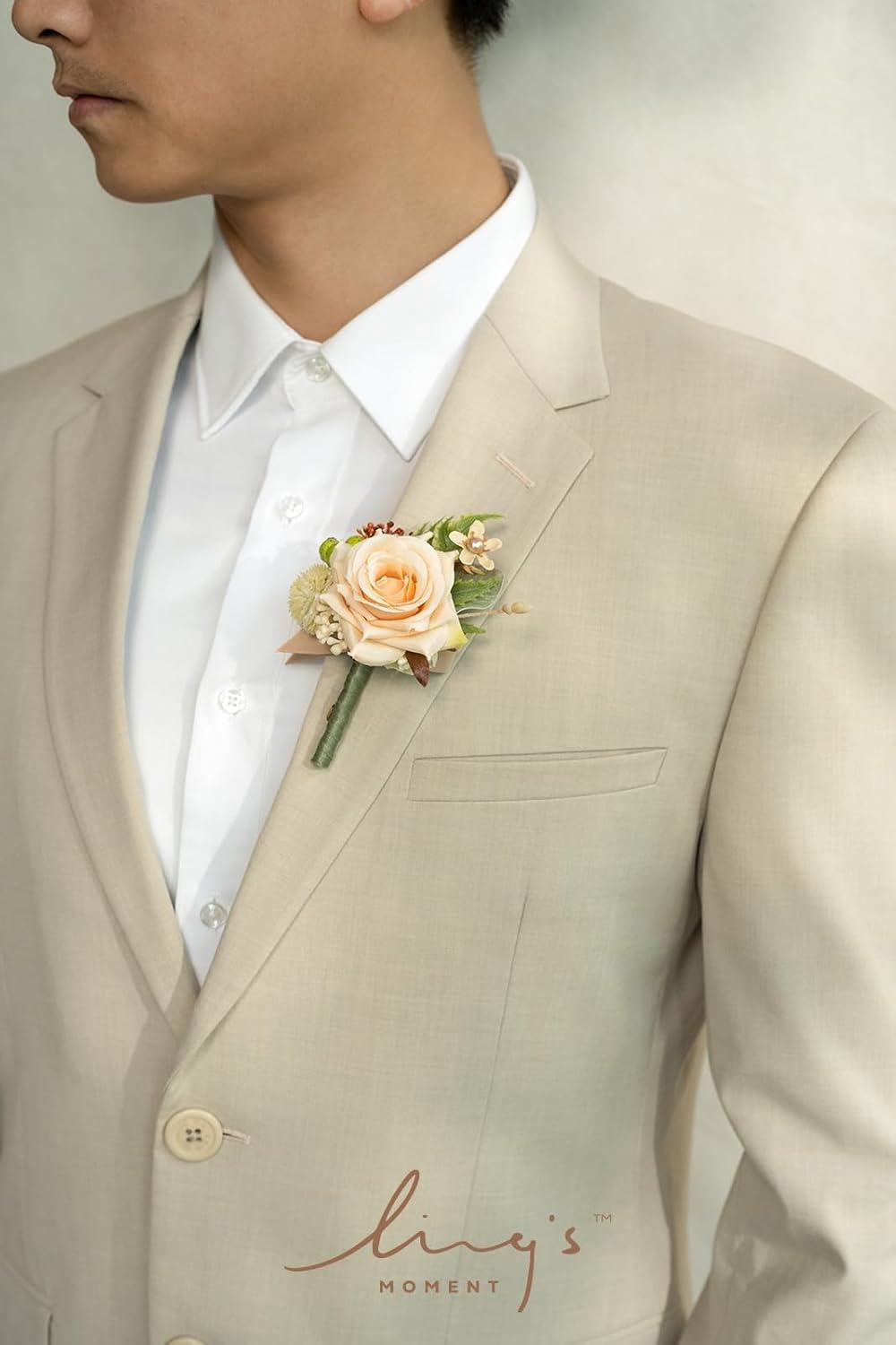 Ling’s moment Boutonniere for Men, 6pcs Groom Groomsmen Boutonniere, Artificial Flowers for Wedding Decor/Prom/Homecoming, etc.Sand Beige White(Or-yellow Apricot & Peach)