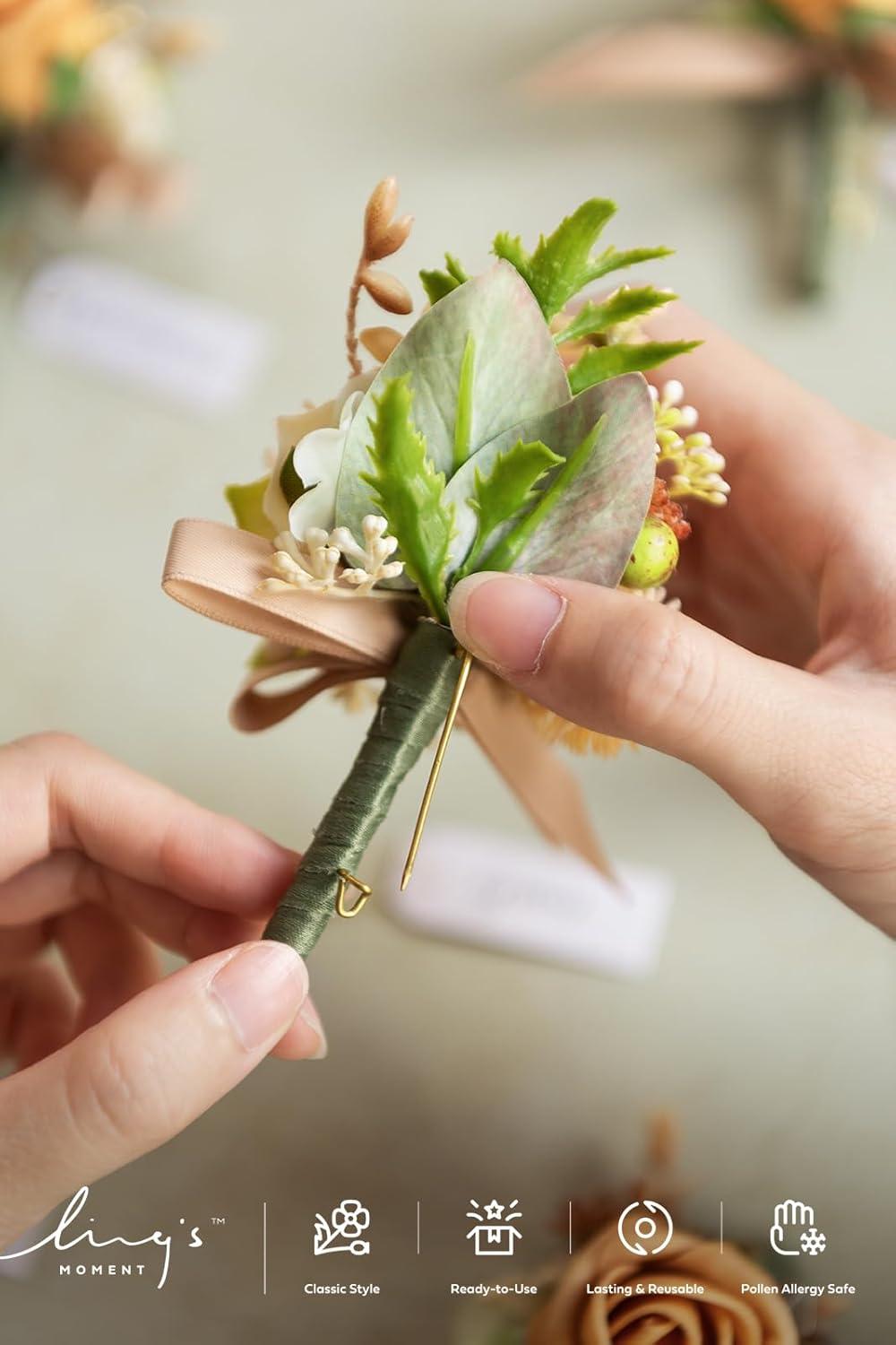 Ling’s moment Boutonniere for Men, 6pcs Groom Groomsmen Boutonniere, Artificial Flowers for Wedding Decor/Prom/Homecoming, etc.Sand Beige White(Or-terracotta & White)
