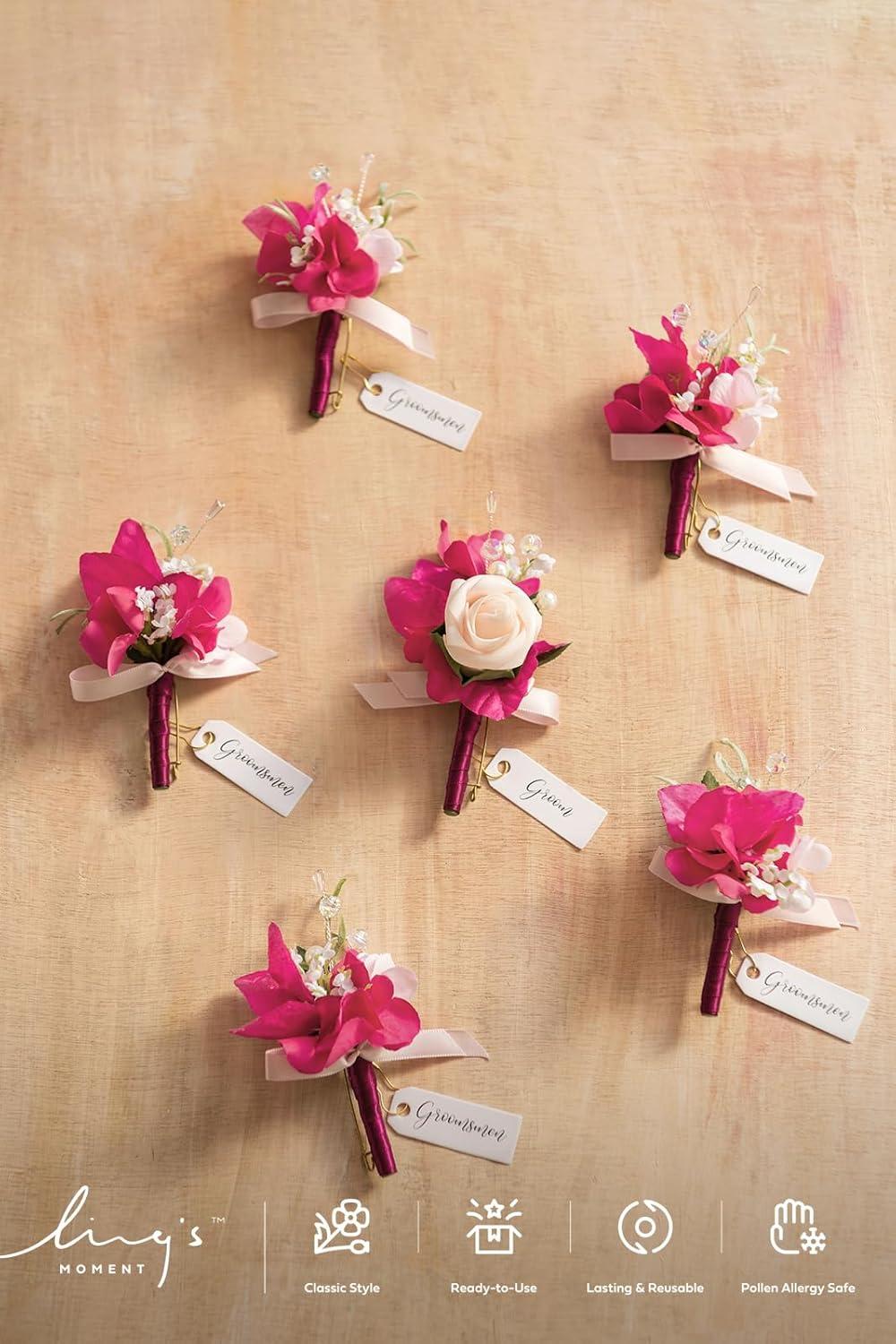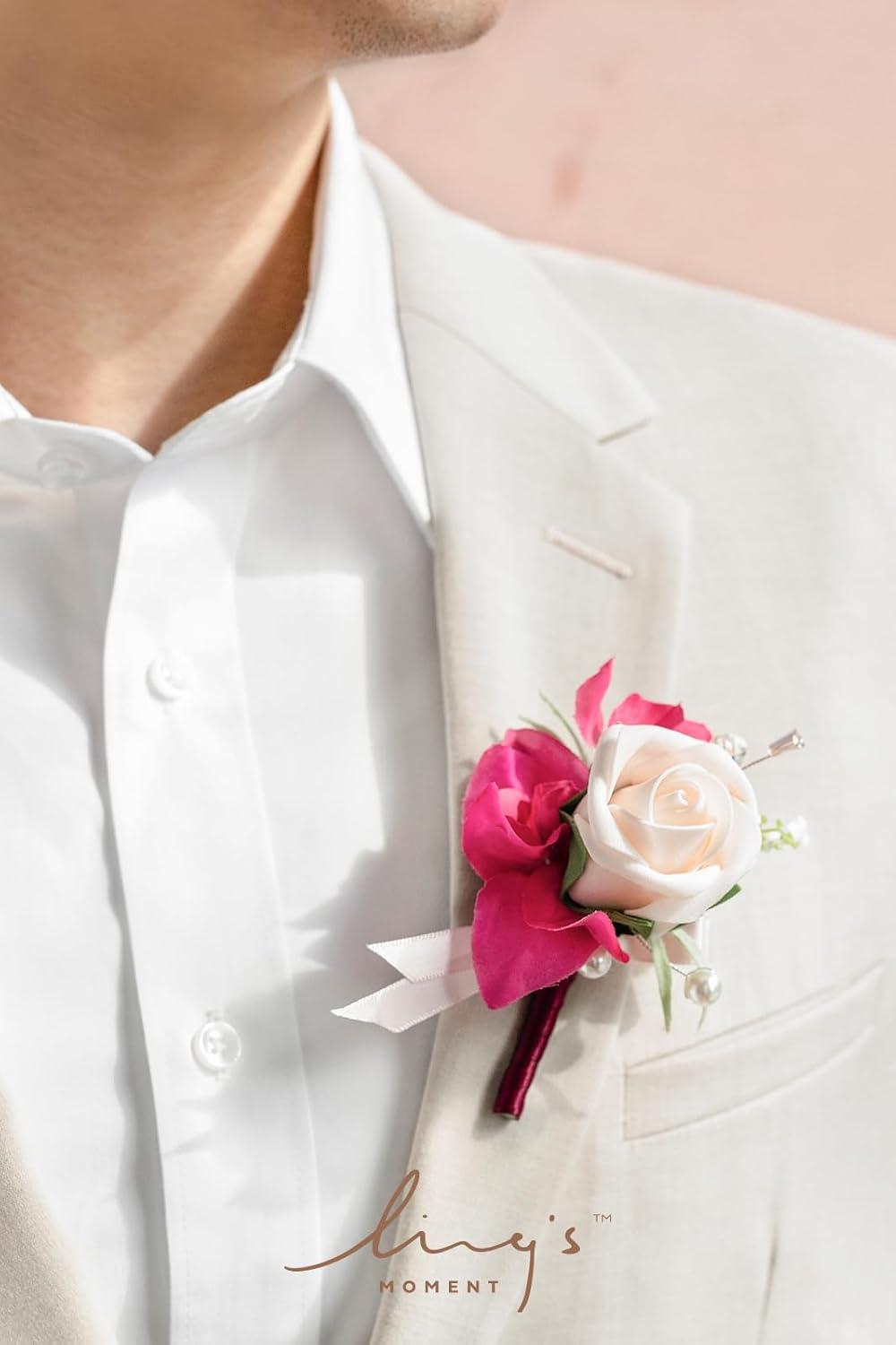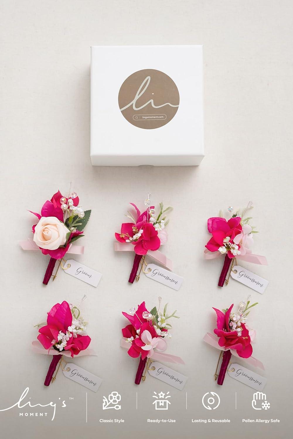 Ling's moment Boutonniere for Men, 6pcs Groom Groomsmen Boutonniere, Artificial Flowers for Wedding Decor/Prom/Homecoming, etc.Sand Beige White(Pk-blush & Hot Pink)