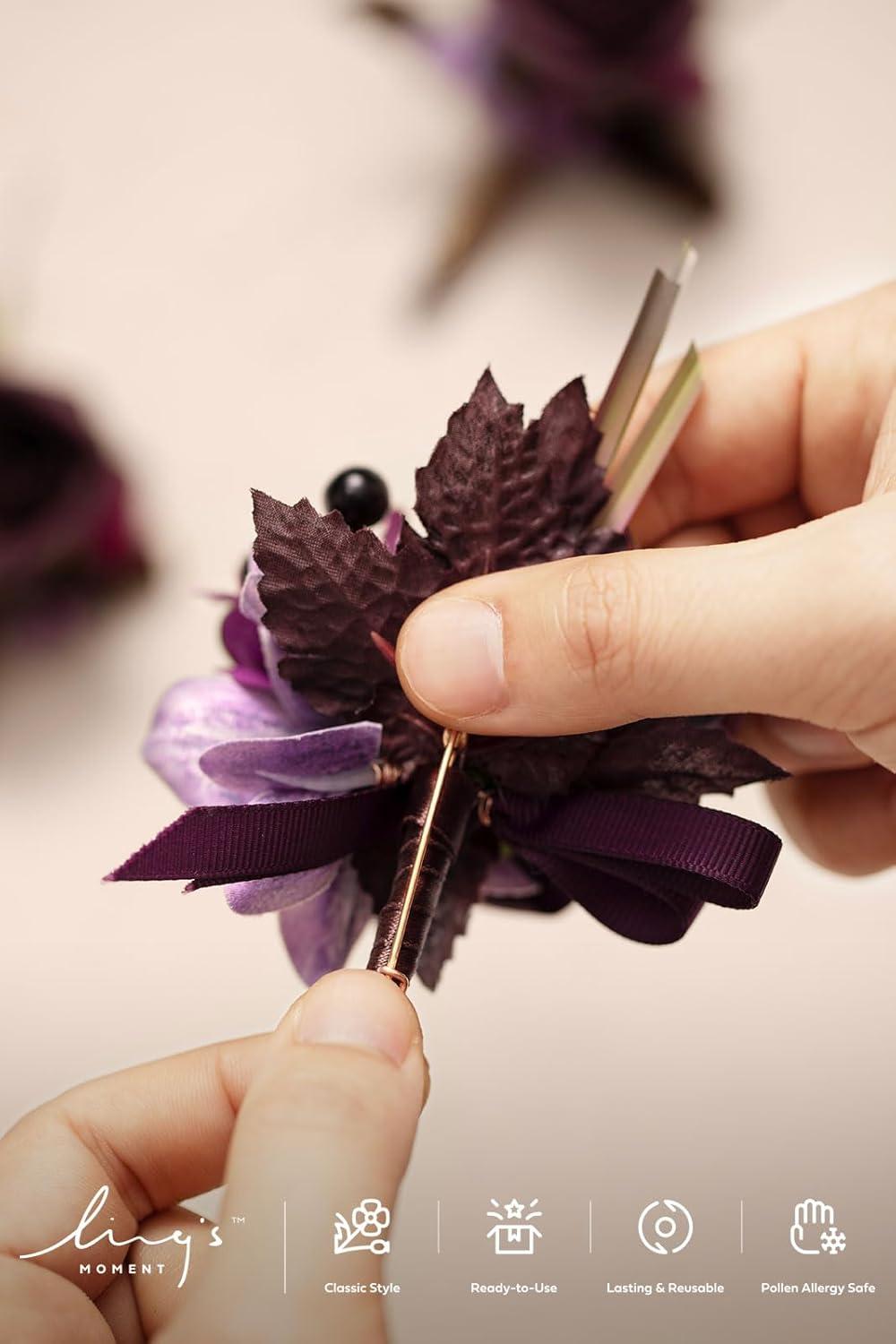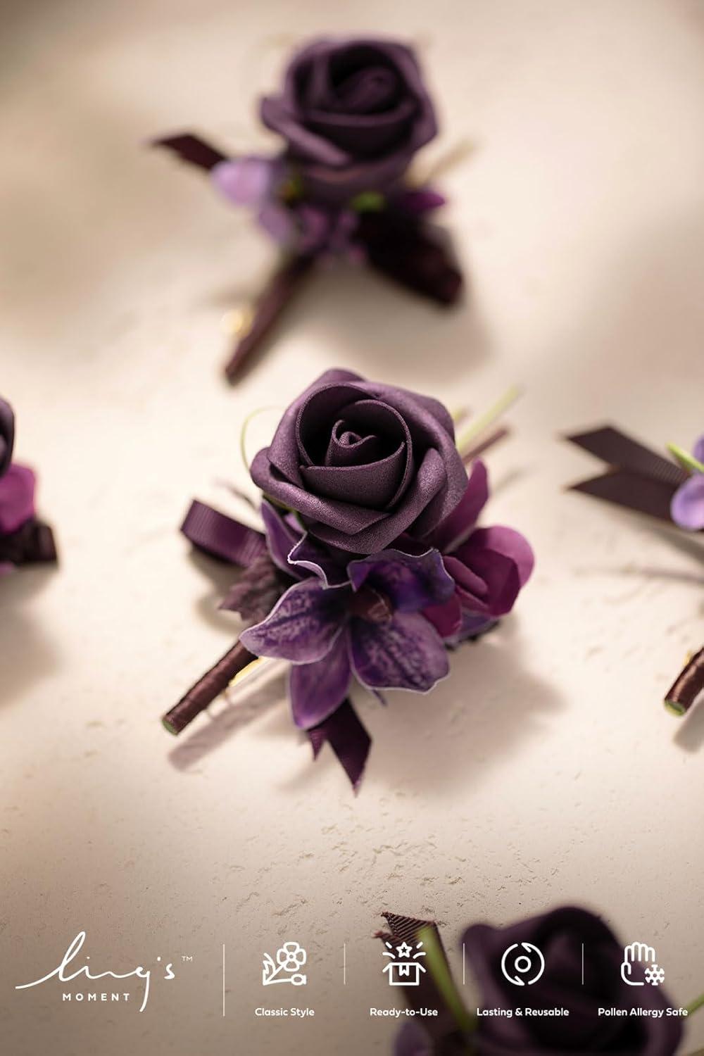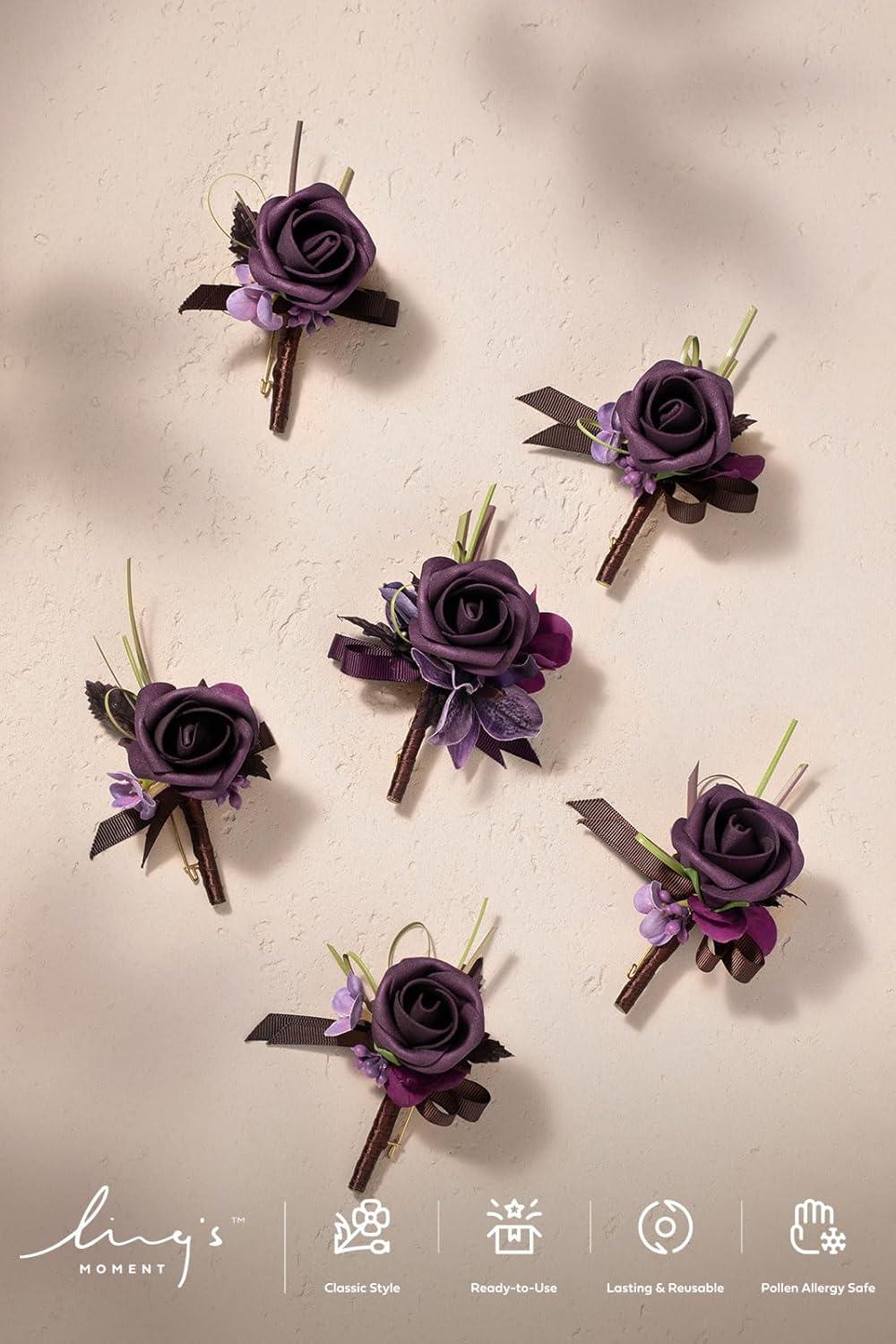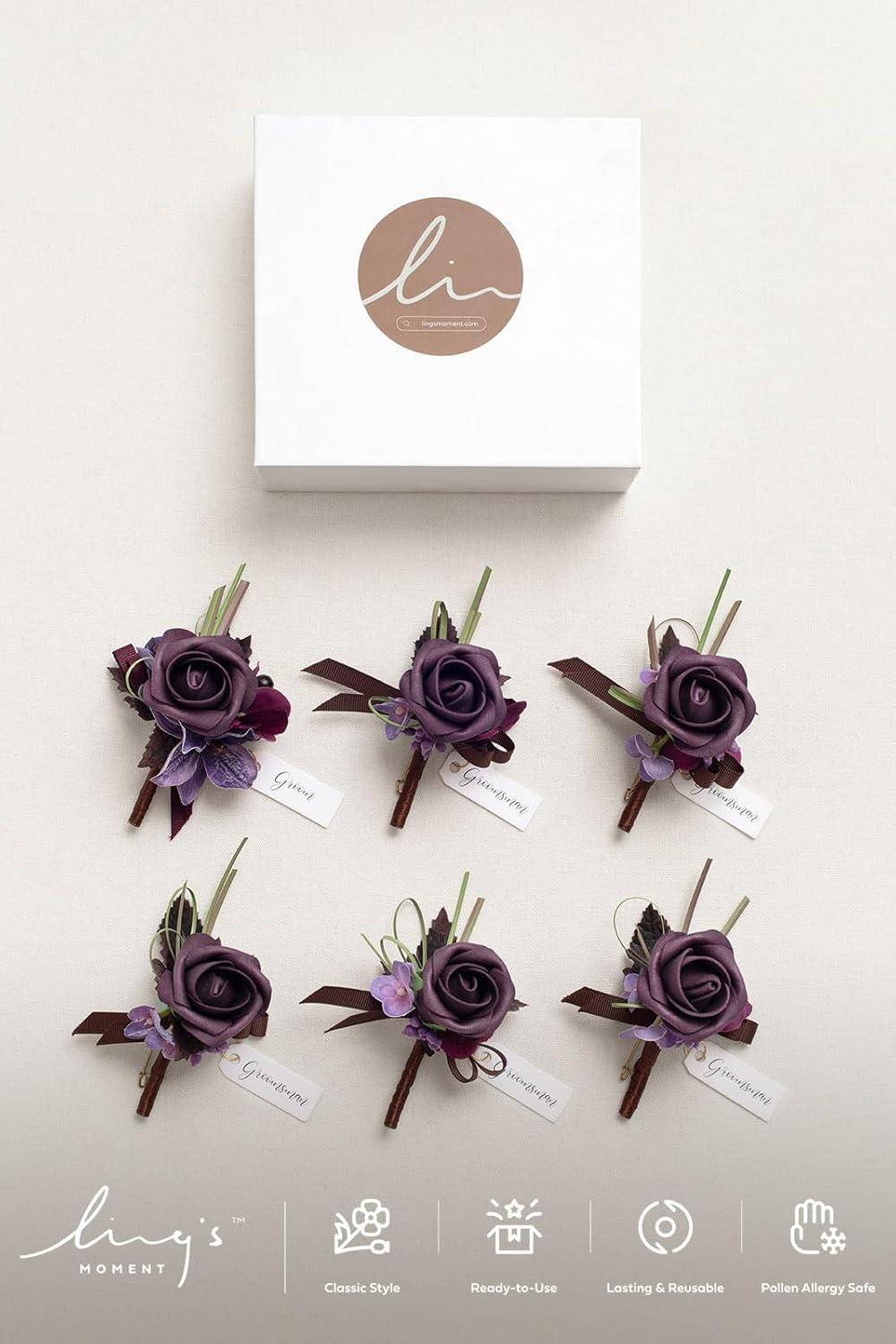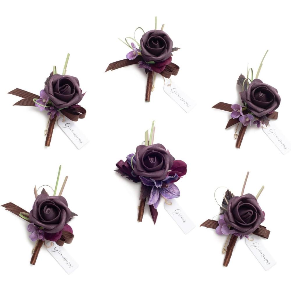 Ling’s moment Boutonniere for Men, 6pcs Groom Groomsmen Boutonniere, Artificial Flowers for Wedding Decor/Prom/Homecoming, etc.Sand Beige White(Prpl-deep Purple)