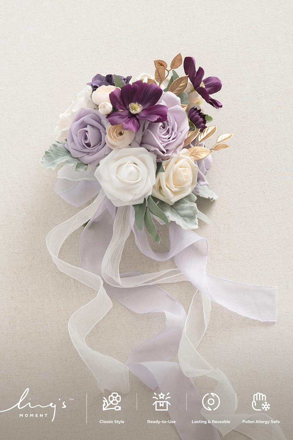 Ling’s moment Bridesmaid Bouquet, Wedding Bouquets for Bridesmaids, 7 Inch Bridal Bouquets for Bridesmaids, Wedding, Ceremony, Anniversary, etc.(Prpl-gold & Lilac)
