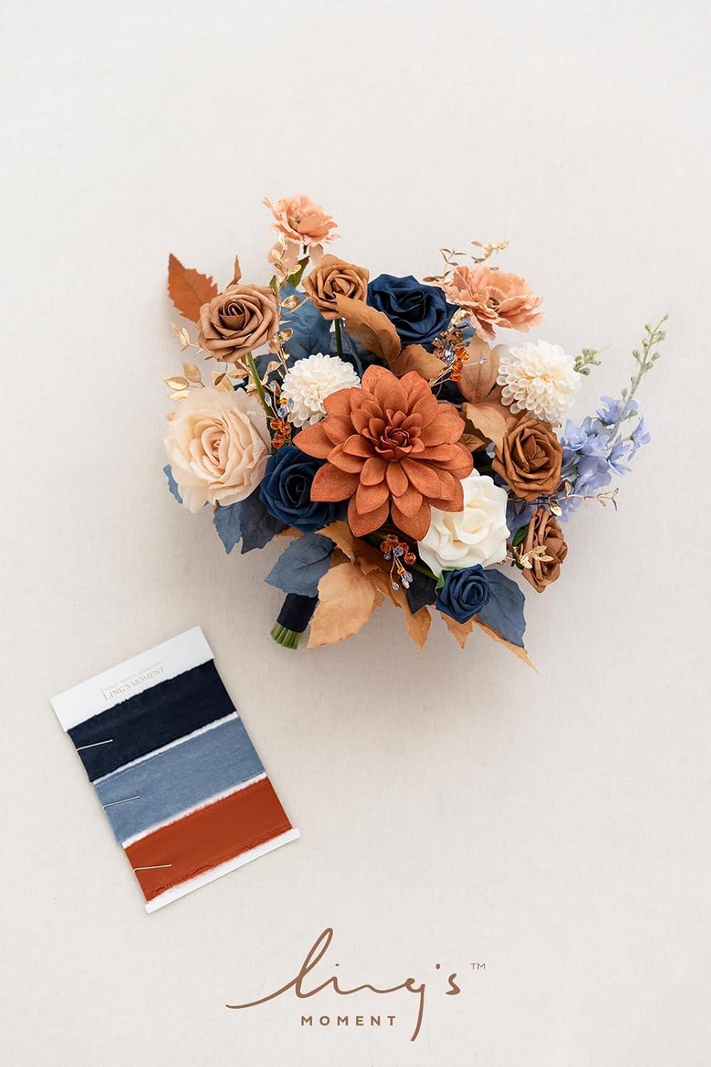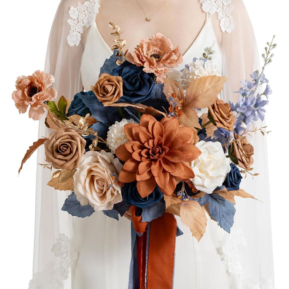 Ling’s moment Dusty Rose Wedding Bouquets for Bride, Pink Bridal Bouquets for Bride, 13 Inch Free Form Artificial Wedding Flower Bouquet(Blu-burnt Orange & Navy)