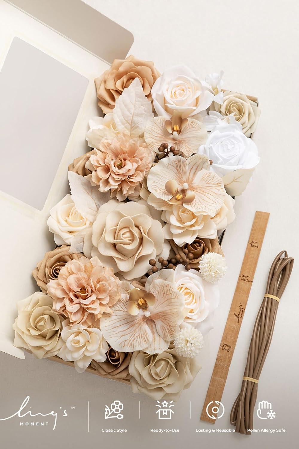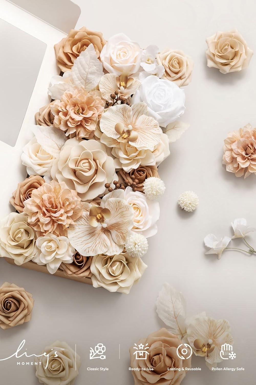 Ling’s moment Fake Flowers Box, Faux Artificial Greenery Stems Foam Roses Silk Fabic Flower for Centerpieces Bouquet Wedding Table Floral Arrangements Bridal Shower Party, Tawny Beige, Deluxe Combo(Beg-sand Beige & Walnut Brown)
