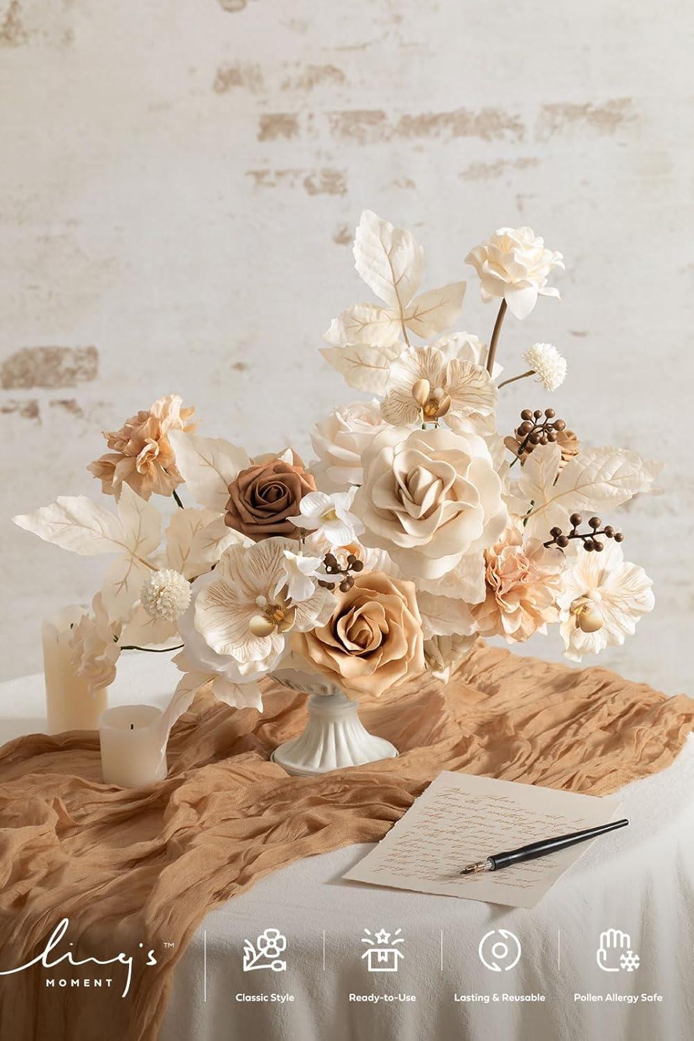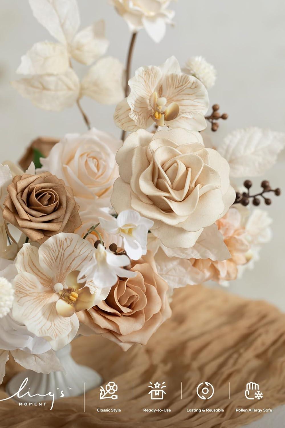 Ling’s moment Fake Flowers Box, Faux Artificial Greenery Stems Foam Roses Silk Fabic Flower for Centerpieces Bouquet Wedding Table Floral Arrangements Bridal Shower Party, Tawny Beige, Deluxe Combo(Beg-tawny Beige)