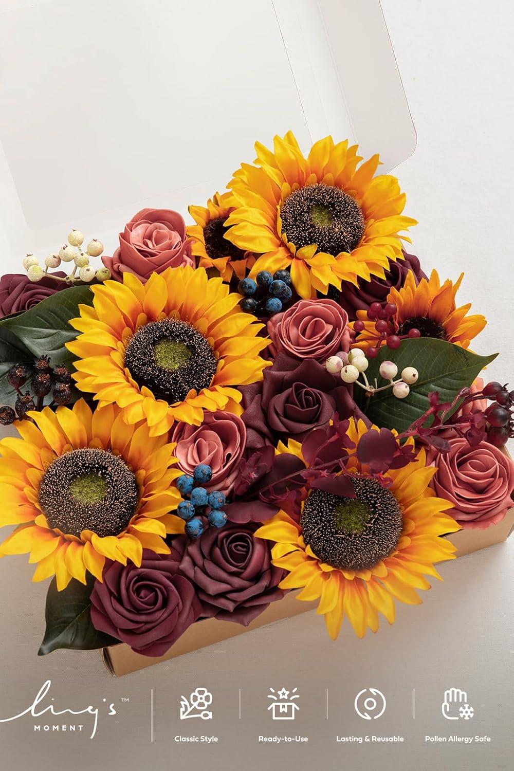 Ling's moment Fake Flowers Box, Faux Artificial Greenery Stems Foam Roses Silk Fabic Flower for Centerpieces Bouquet Wedding Table Floral Arrangements Bridal Shower Party, Tawny Beige, Deluxe Combo(Or-sunflower & Marsala)