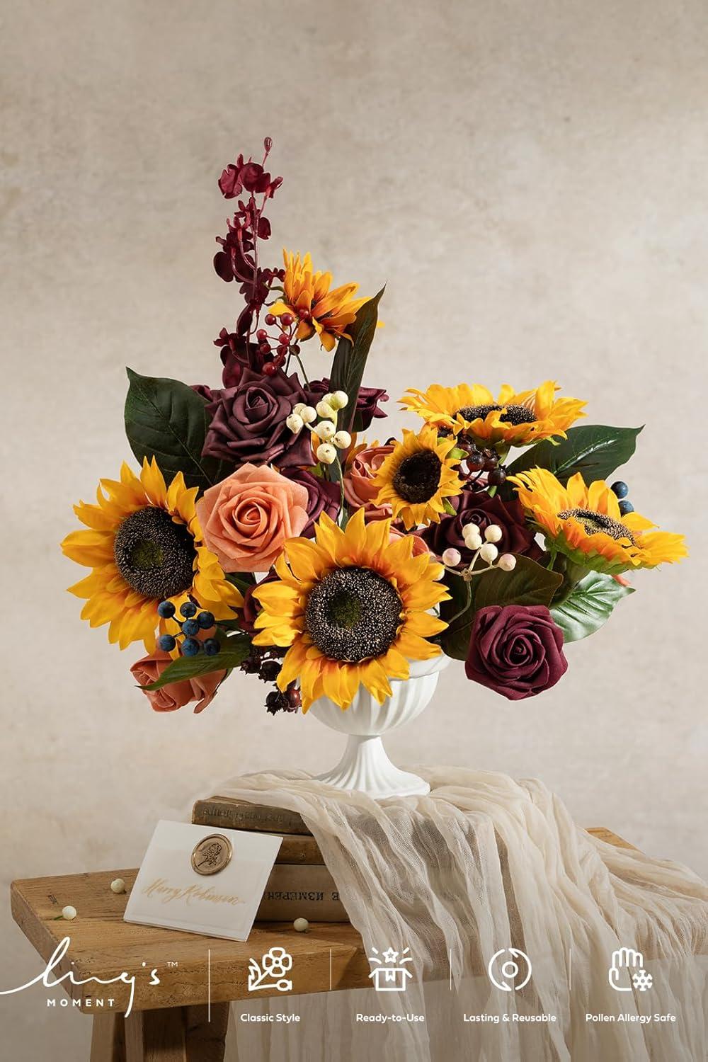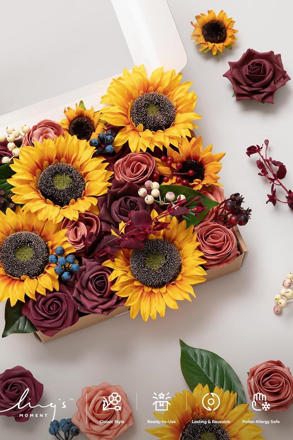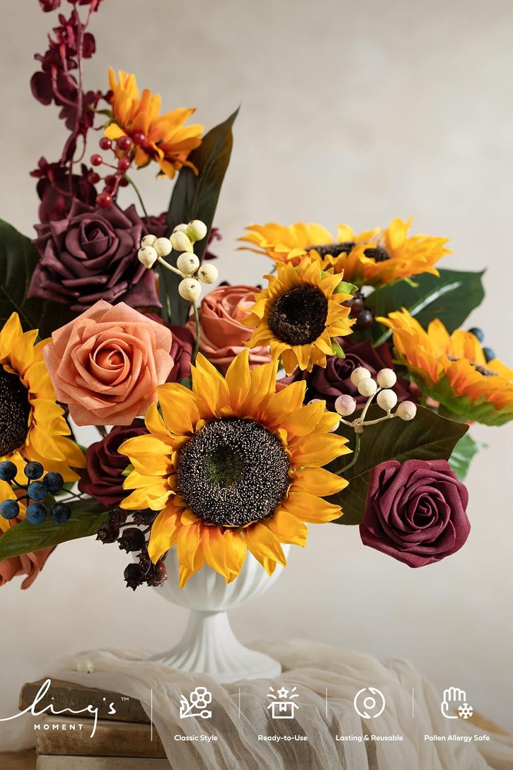 imageLings moment Fake Flowers Box Faux Artificial Greenery Stems Foam Roses Silk Fabic Flower for Centerpieces Bouquet Wedding Table Floral Arrangements Bridal Shower Party Tawny Beige Deluxe ComboOrsunflower  Marsala