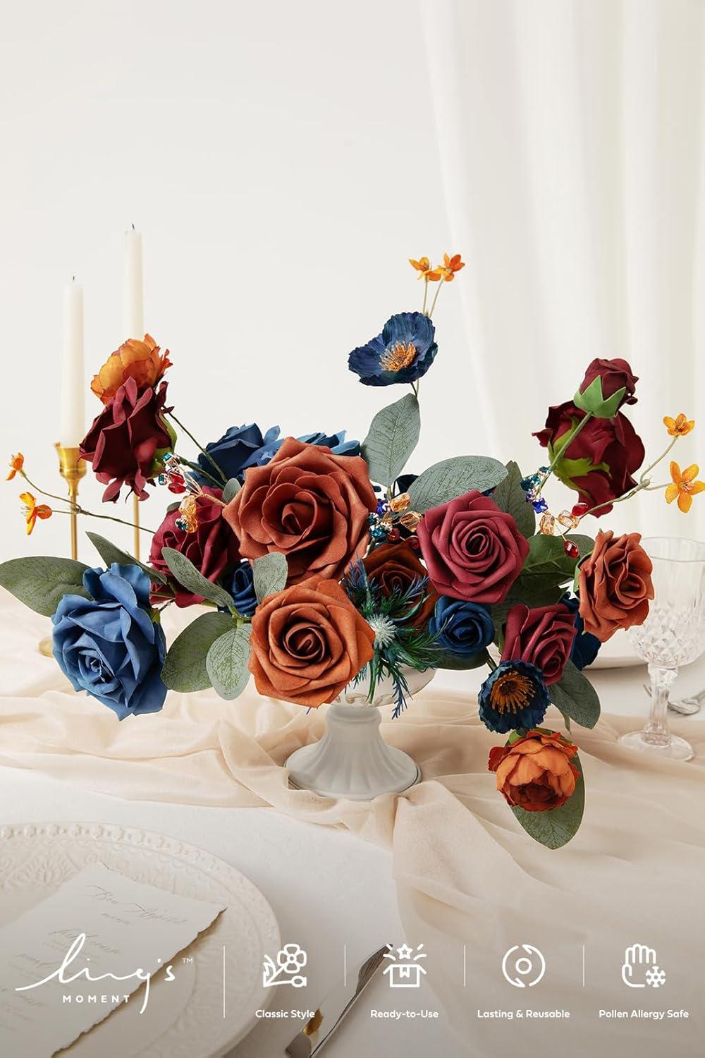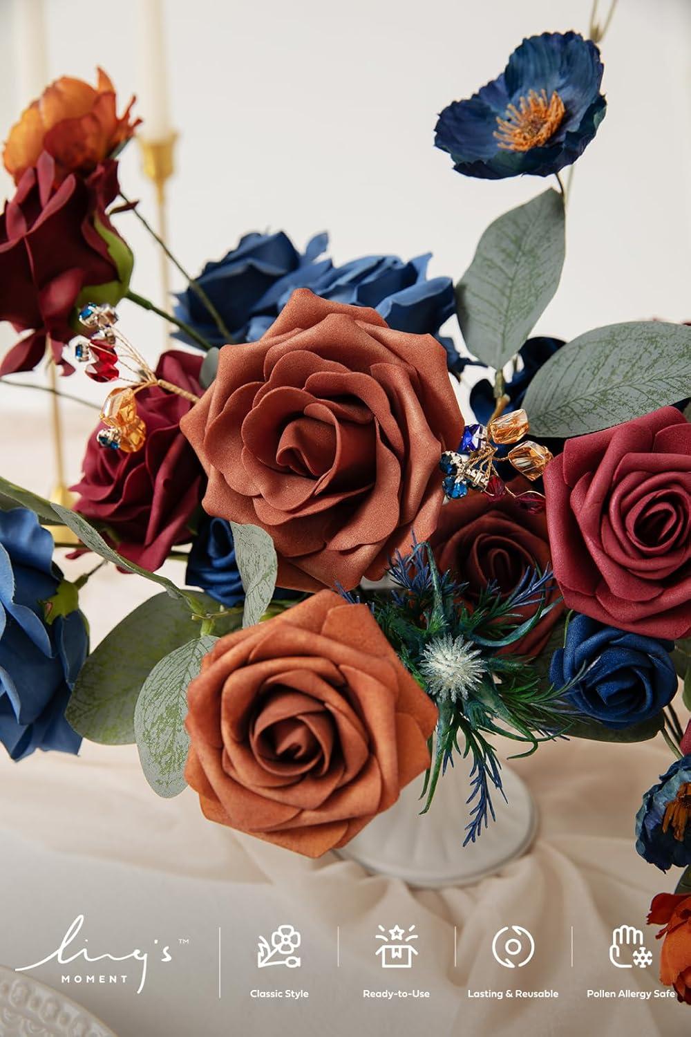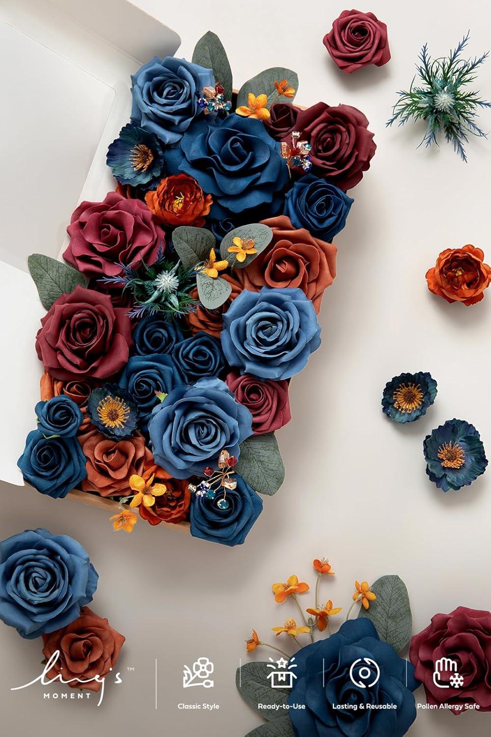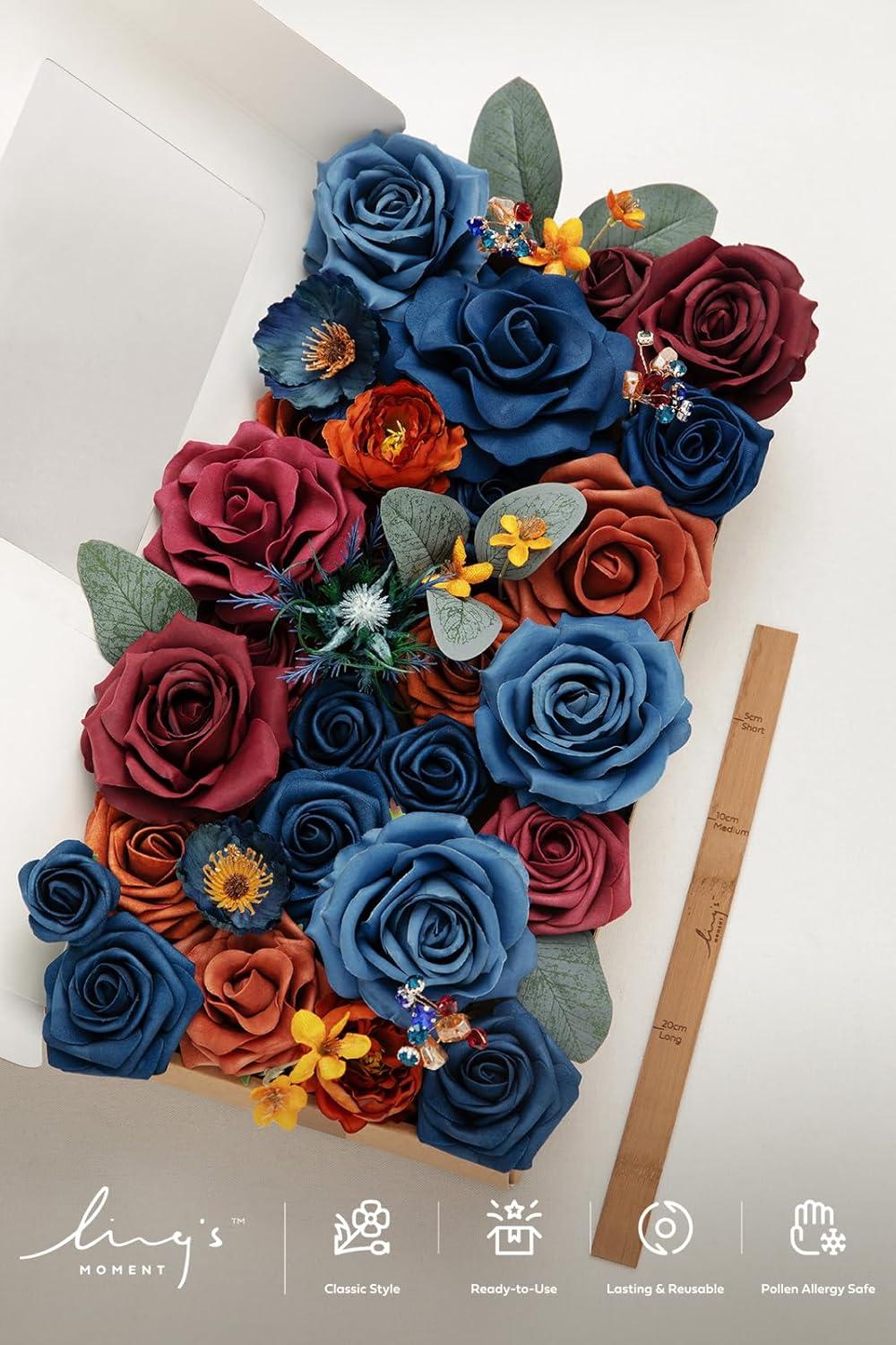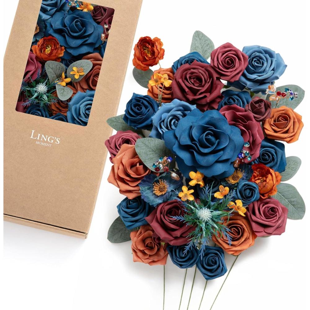 imageLings moment Fake Flowers Box Faux Artificial Greenery Stems Foam Roses Silk Fabic Flower for Centerpieces Bouquet Wedding Table Floral Arrangements Bridal Shower Party Tawny Beige Deluxe ComboOrmandarin  Royal Blue