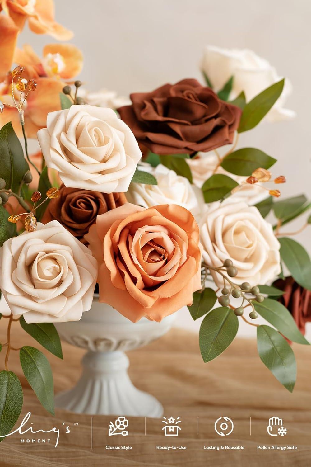 Ling’s moment Fake Flowers Box, Faux Artificial Greenery Stems Foam Roses Silk Fabic Flower for Centerpieces Bouquet Wedding Table Floral Arrangements Bridal Shower Party, Tawny Beige, Deluxe Combo(Or-orange & Nude)