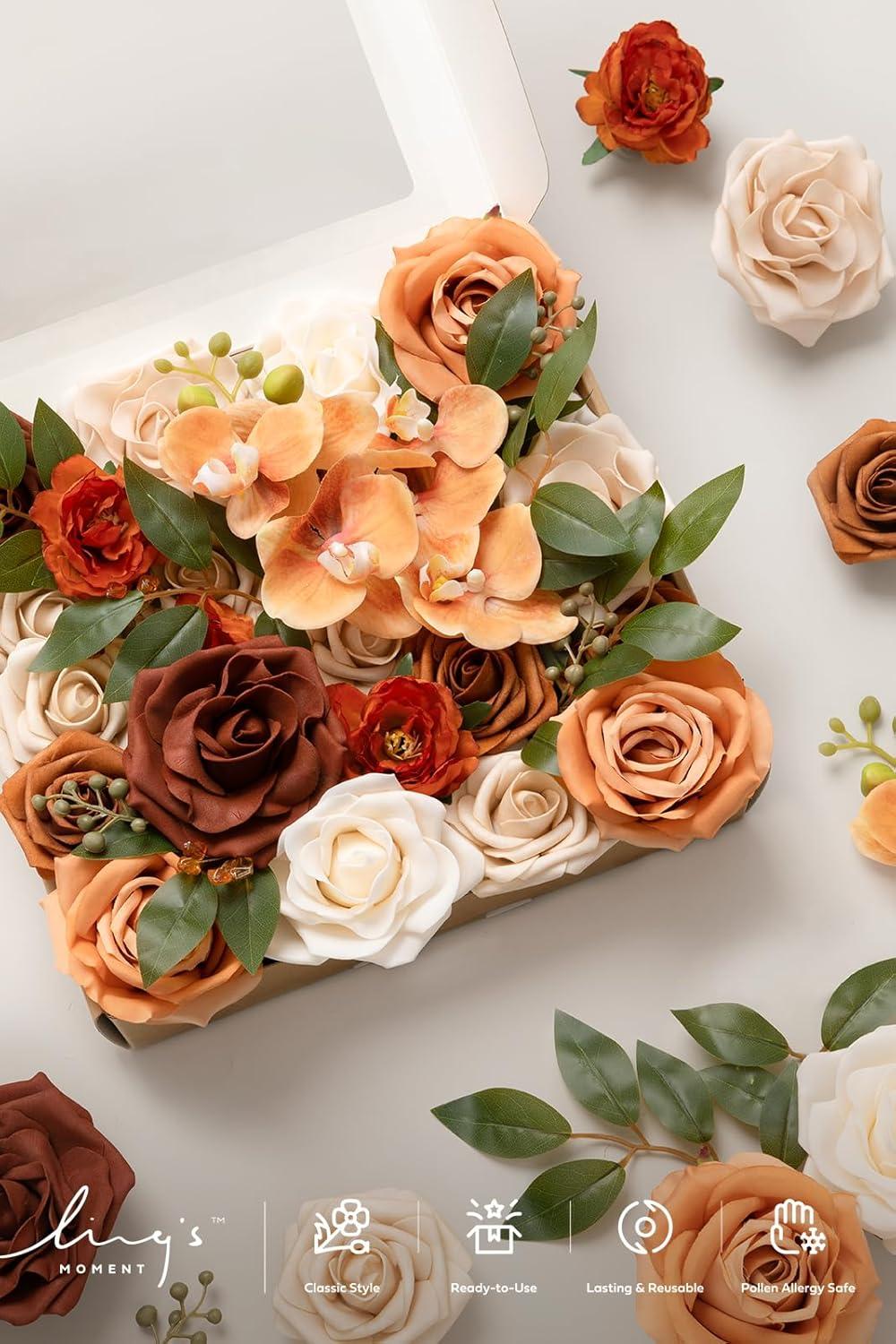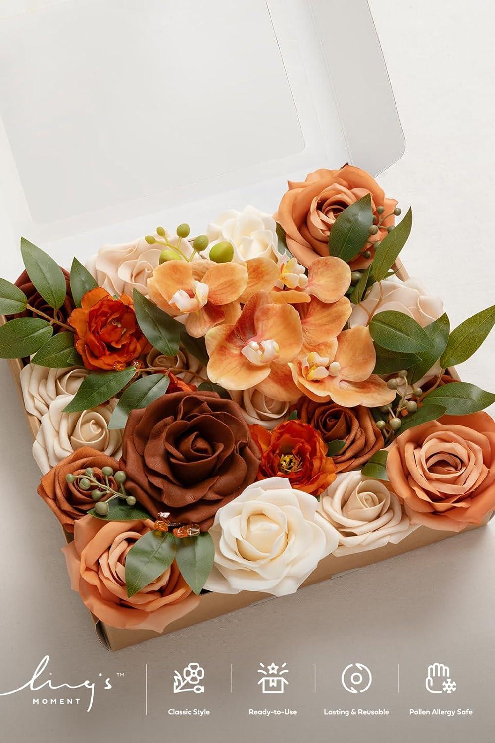 Ling's moment Fake Flowers Box, Faux Artificial Greenery Stems Foam Roses Silk Fabic Flower for Centerpieces Bouquet Wedding Table Floral Arrangements Bridal Shower Party, Tawny Beige, Deluxe Combo(Or-orange & Nude)