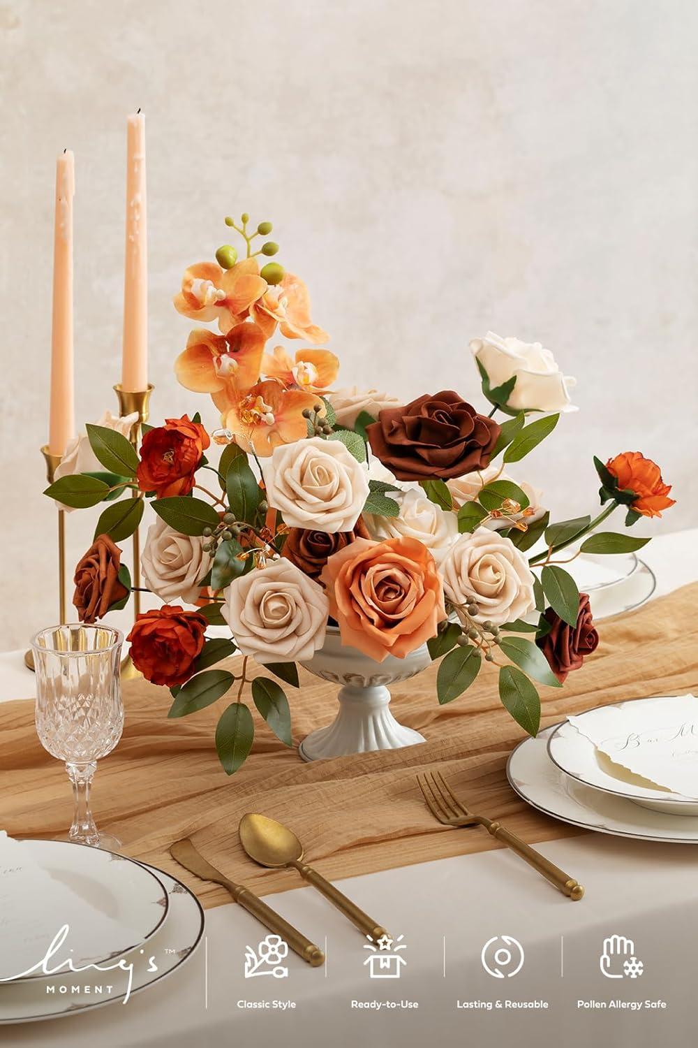 Ling’s moment Fake Flowers Box, Faux Artificial Greenery Stems Foam Roses Silk Fabic Flower for Centerpieces Bouquet Wedding Table Floral Arrangements Bridal Shower Party, Tawny Beige, Deluxe Combo(Or-orange & Soft Peach)