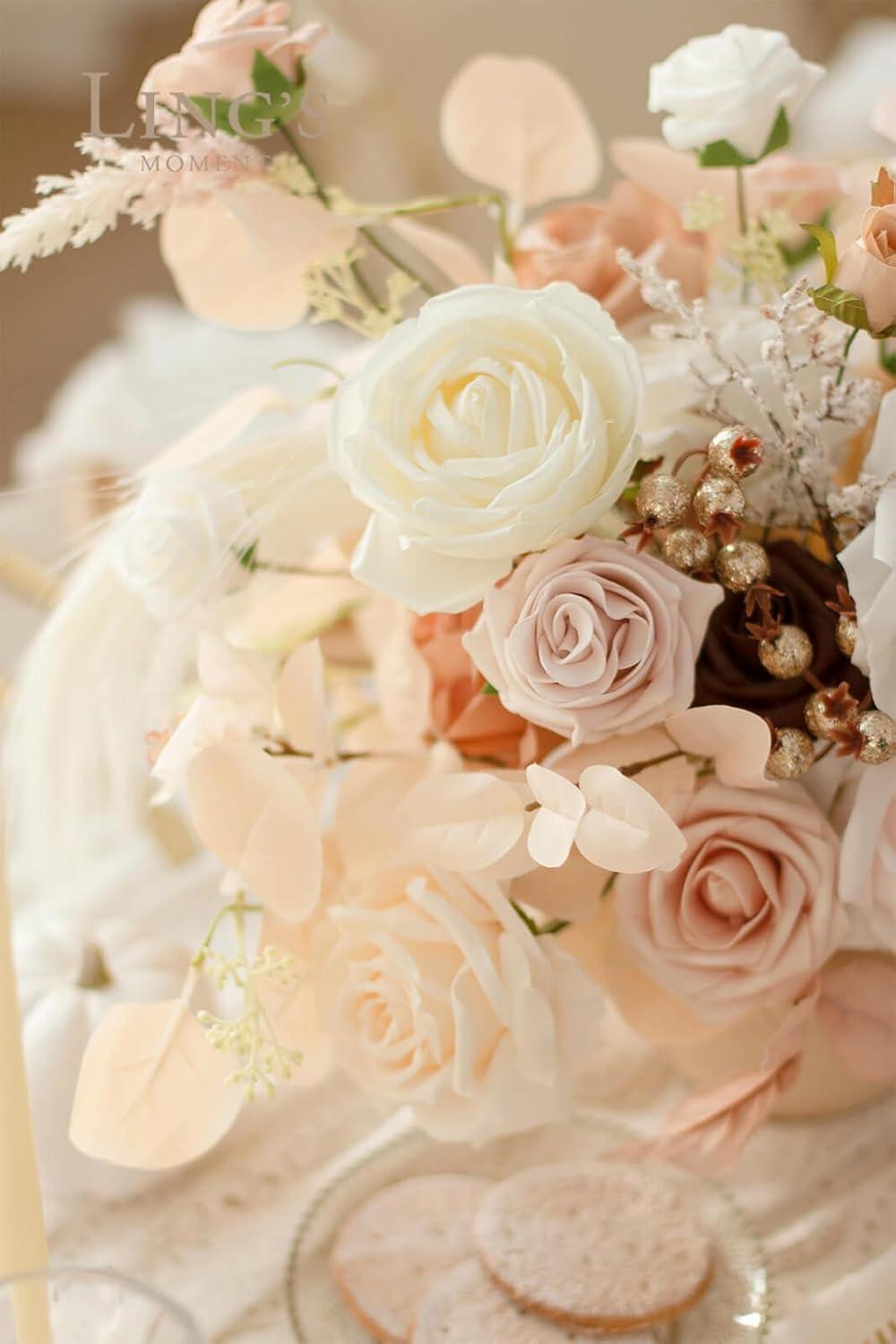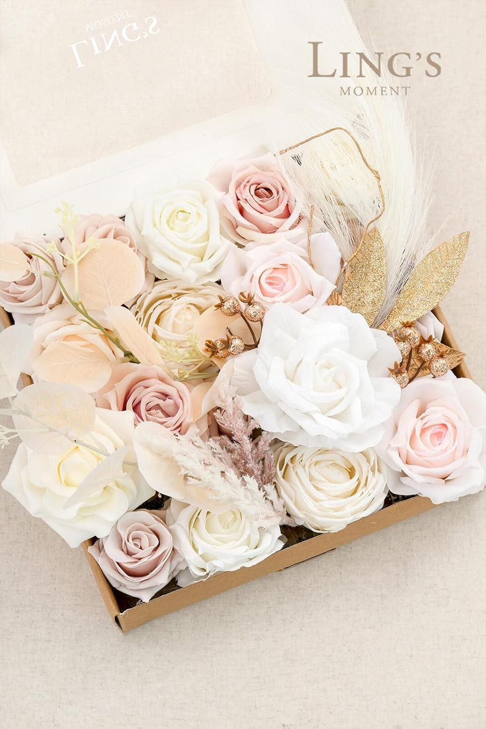 Ling’s moment Fake Flowers Box, Faux Artificial Greenery Stems Foam Roses Silk Leaves for Centerpieces Bouquet Wedding Floral Arrangements Bridal Shower Party, Lavender & Cream, Deluxe Combo(Beg-beige & Sepia)