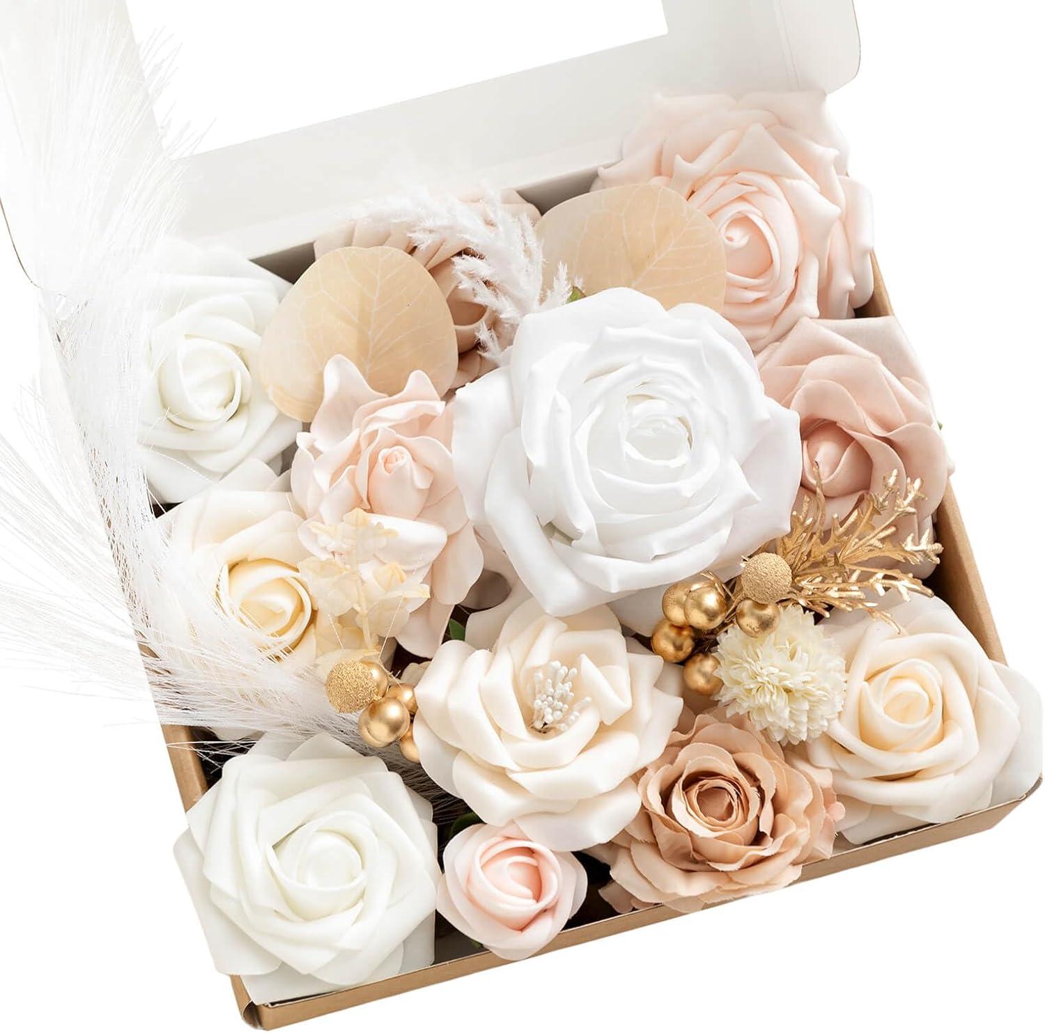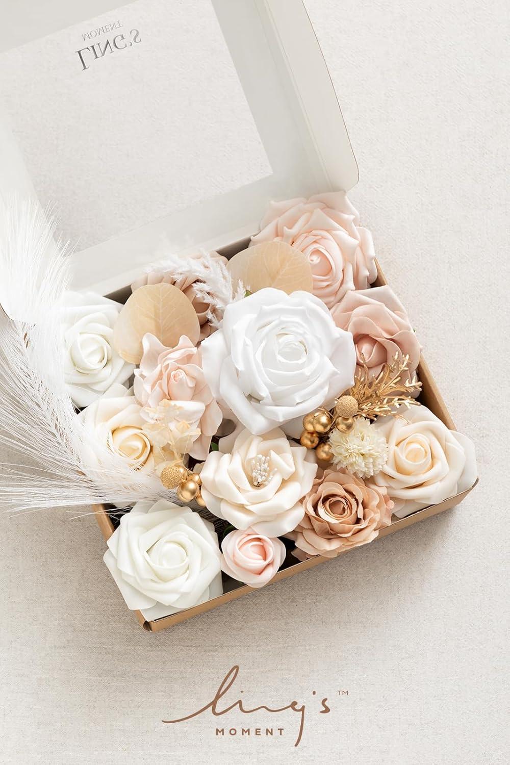 Ling’s moment Fake Flowers Box, Faux Artificial Greenery Stems Foam Roses Silk Leaves for Centerpieces Bouquet Wedding Floral Arrangements Bridal Shower Party, Lavender & Cream, Deluxe Combo(Beg-white & Beige)