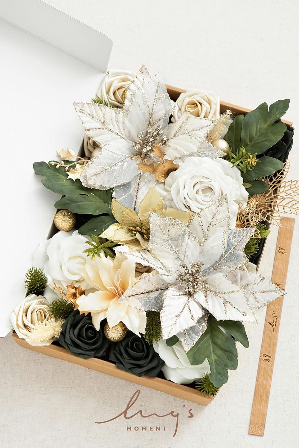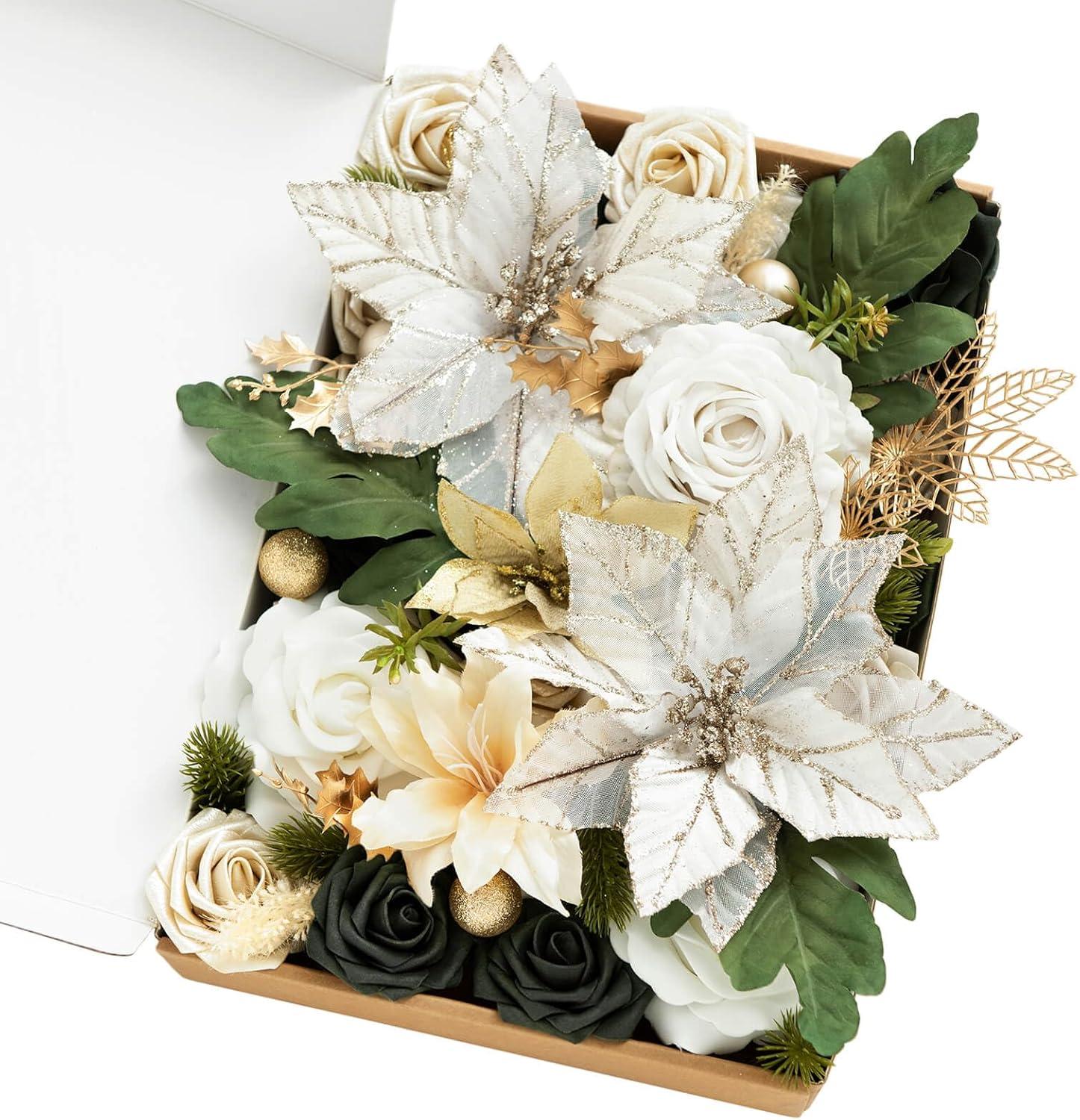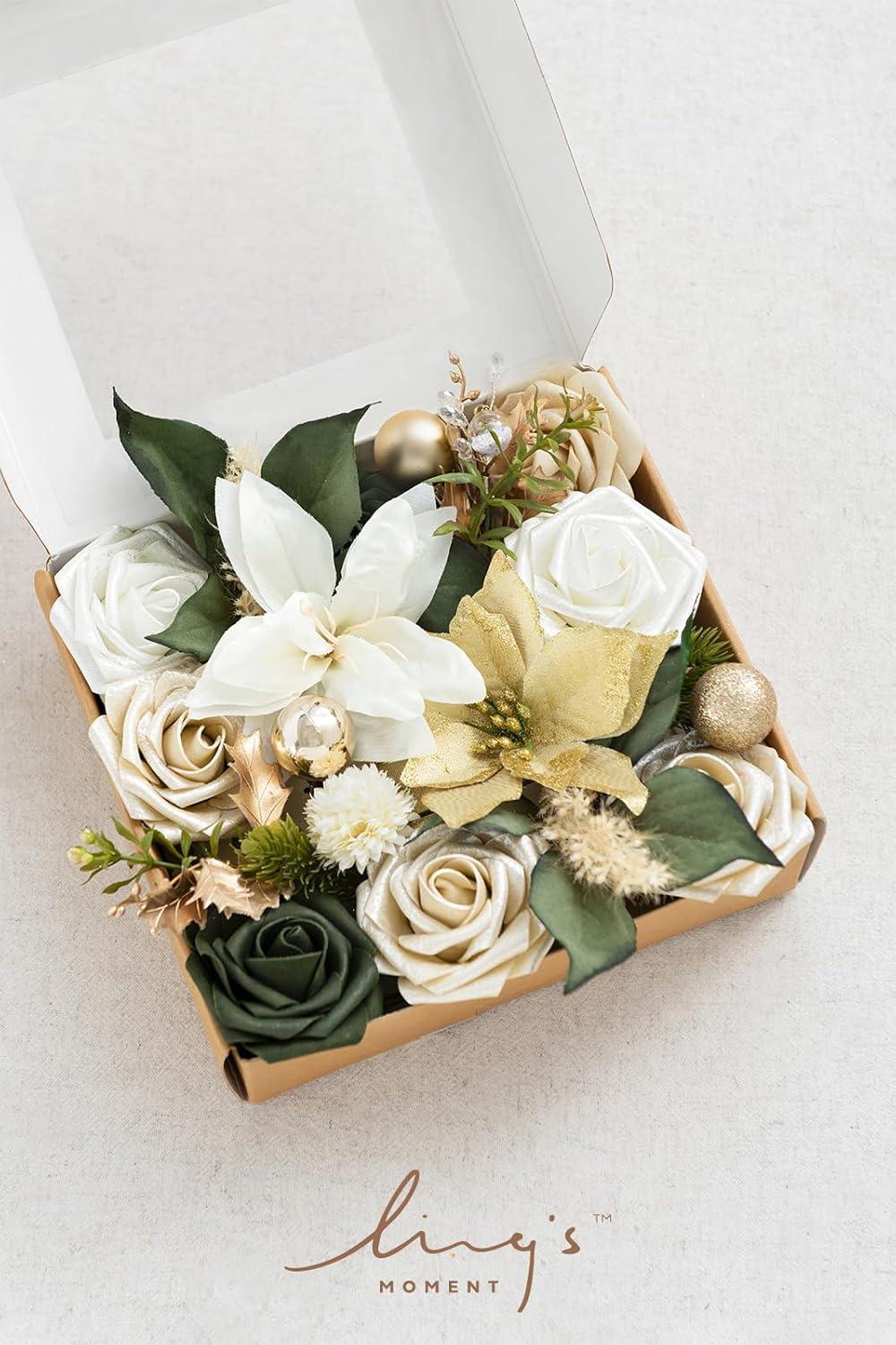 Ling’s moment Fake Flowers Box, Faux Artificial Greenery Stems Foam Roses Silk Leaves for Centerpieces Bouquet Wedding Floral Arrangements Bridal Shower Party, Lavender & Cream, Deluxe Combo(Grn-champagne Chrismas)