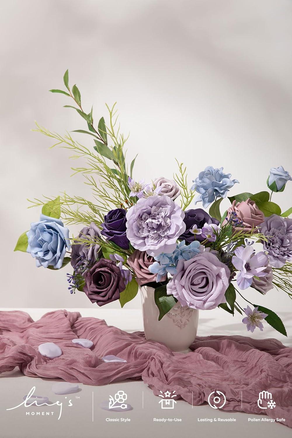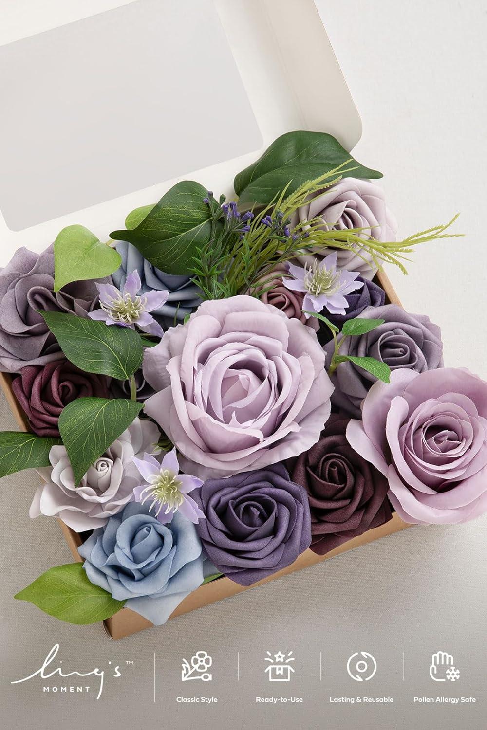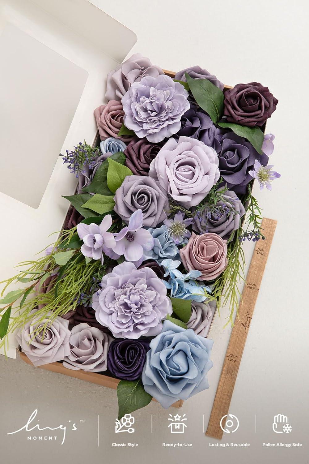 Ling’s moment Fake Flowers Box, Faux Artificial Greenery Stems Foam Roses Silk Leaves for Centerpieces Bouquet Wedding Floral Arrangements Bridal Shower Party, Lavender & Cream, Deluxe Combo(Prpl-lavender & Plum)